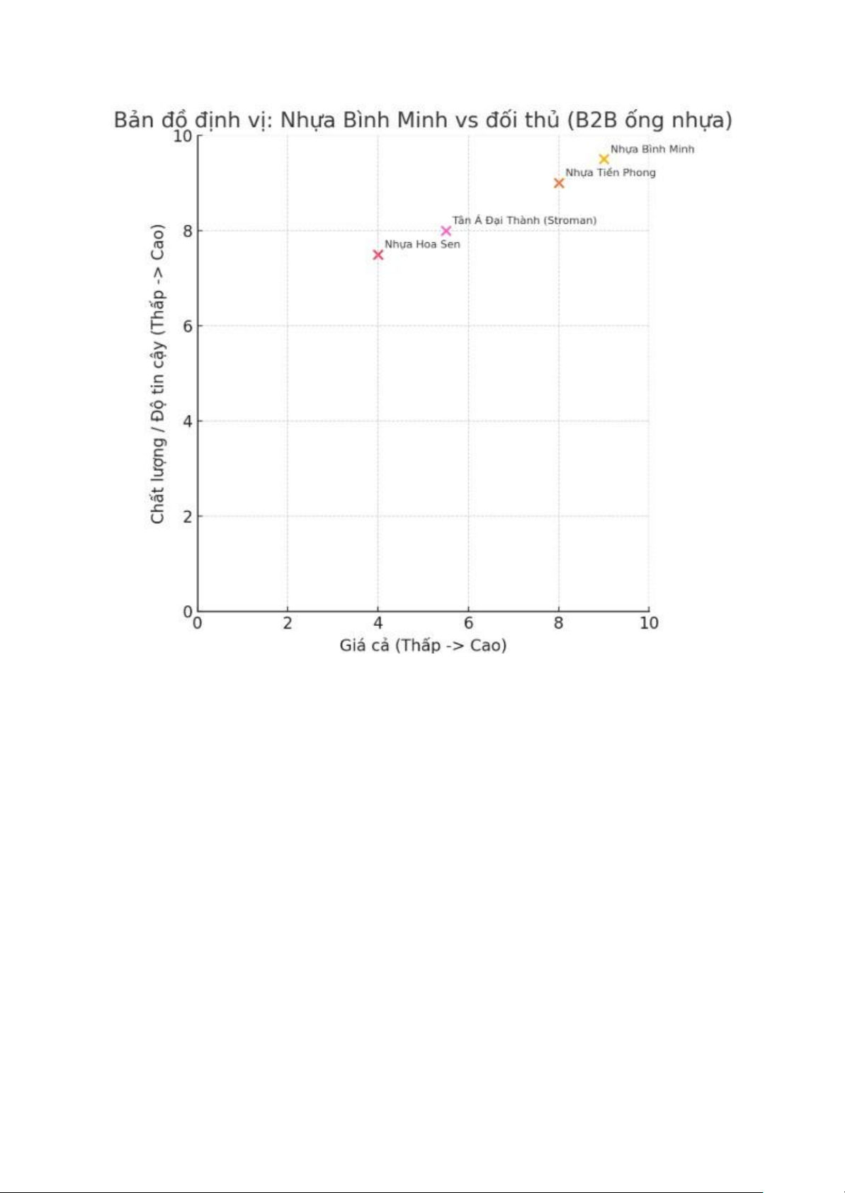 Trên bản đồ, Nhựa Bình Minh nằm ở góc chất lượng cao – giá cao, cho thấy công