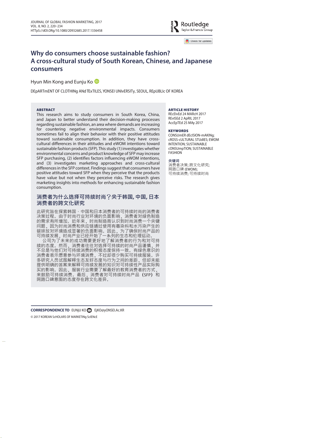 To cite this article: Hyun Min Kong & Eunju Ko (2017) Why do consumers choose sustainable