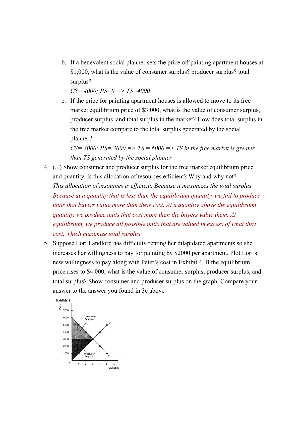 $5,000, what is the value of consumer surplus? producer surplus? total surplus? CS=0; PS=4000 => TS=4000