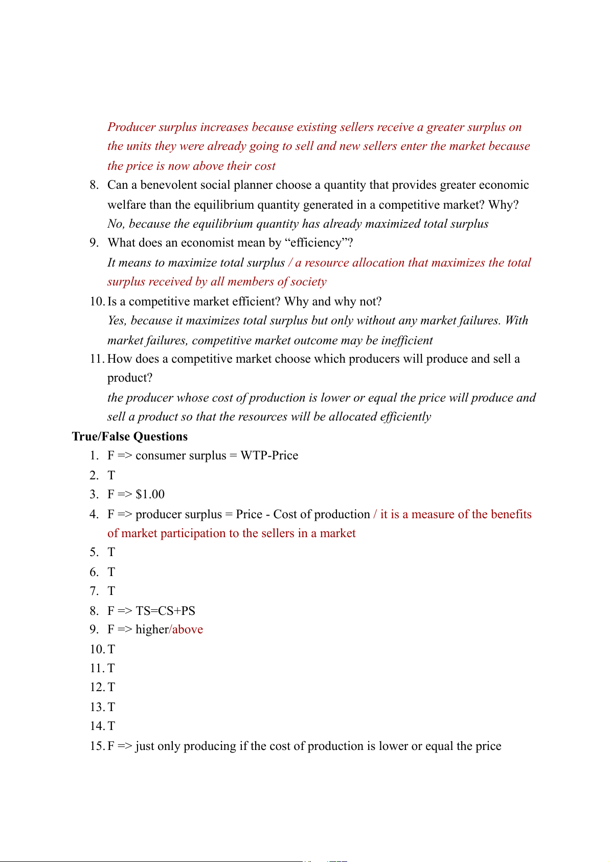 of market participation to the sellers in a market 5. T 6. T 7. T 8. F => TS=CS+PS 9. F => higher/above 10. T 11. T 12. T 13. T 14. T