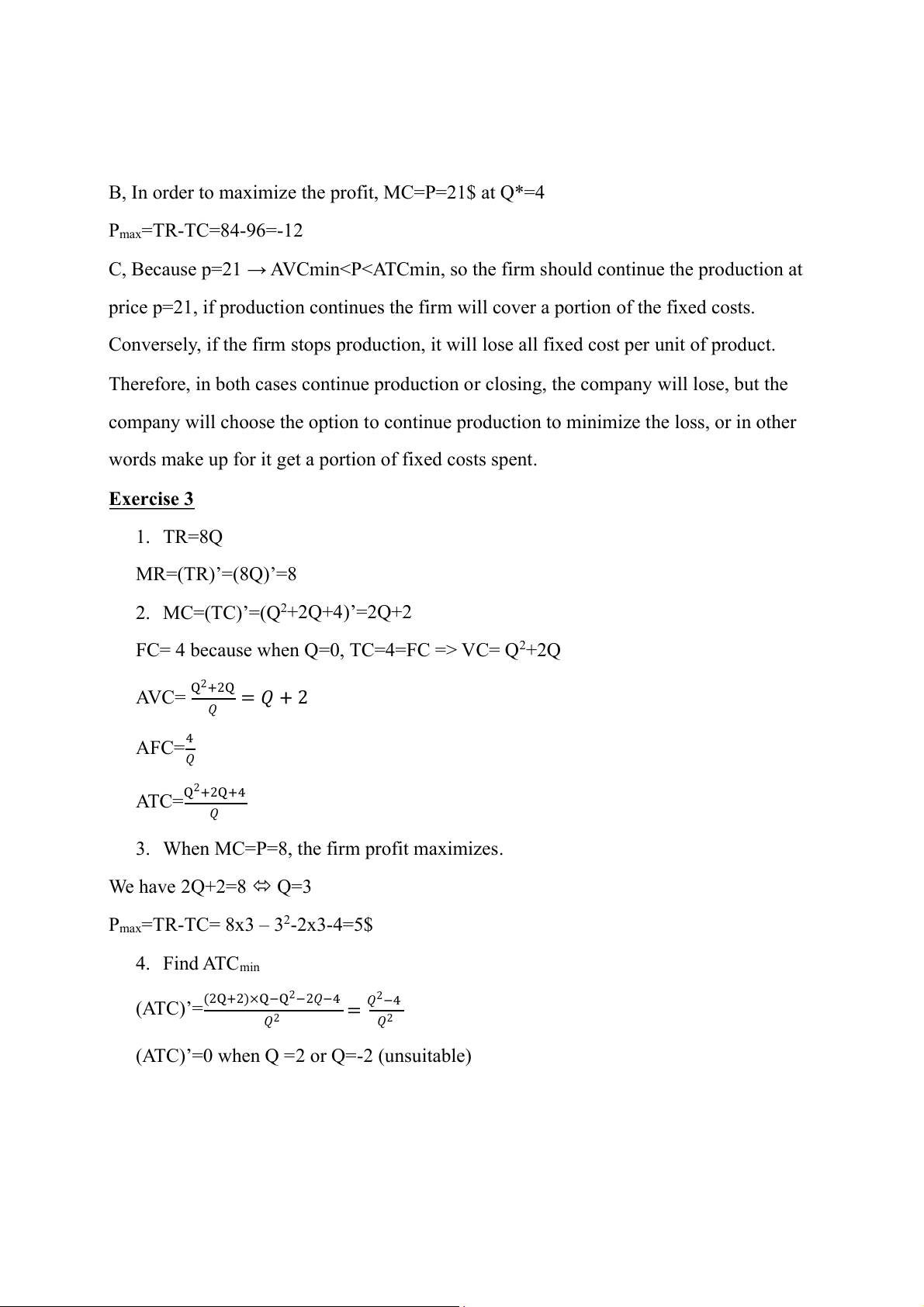 Pmax=TR-TC= 8x3 – 32-2x3-4=5$ 4. Find ATCmin (2Q+2)×Q−Q2−2𝑄−4 (ATC)’= 𝑄2−4 = 𝑄2 𝑄2