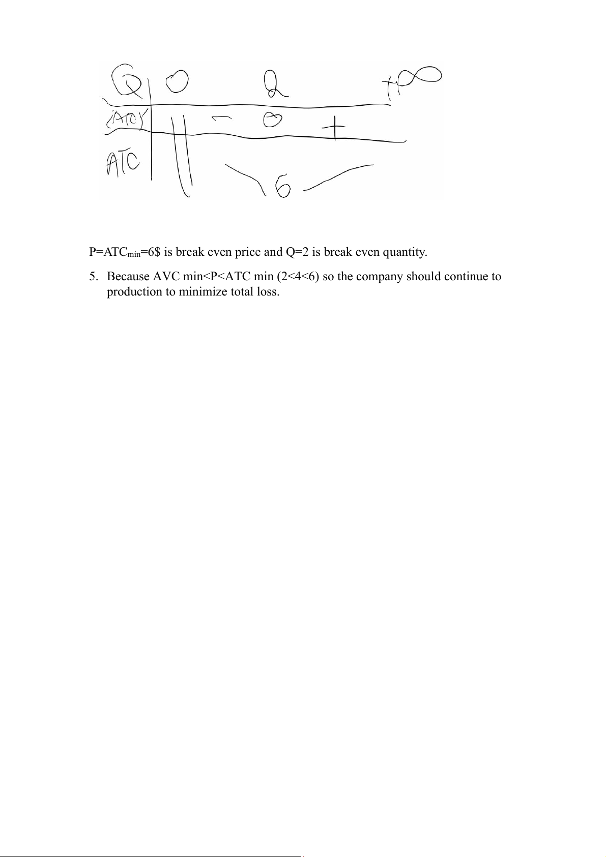 P=ATCmin=6$ is break even price and Q=2 is break even quantity.