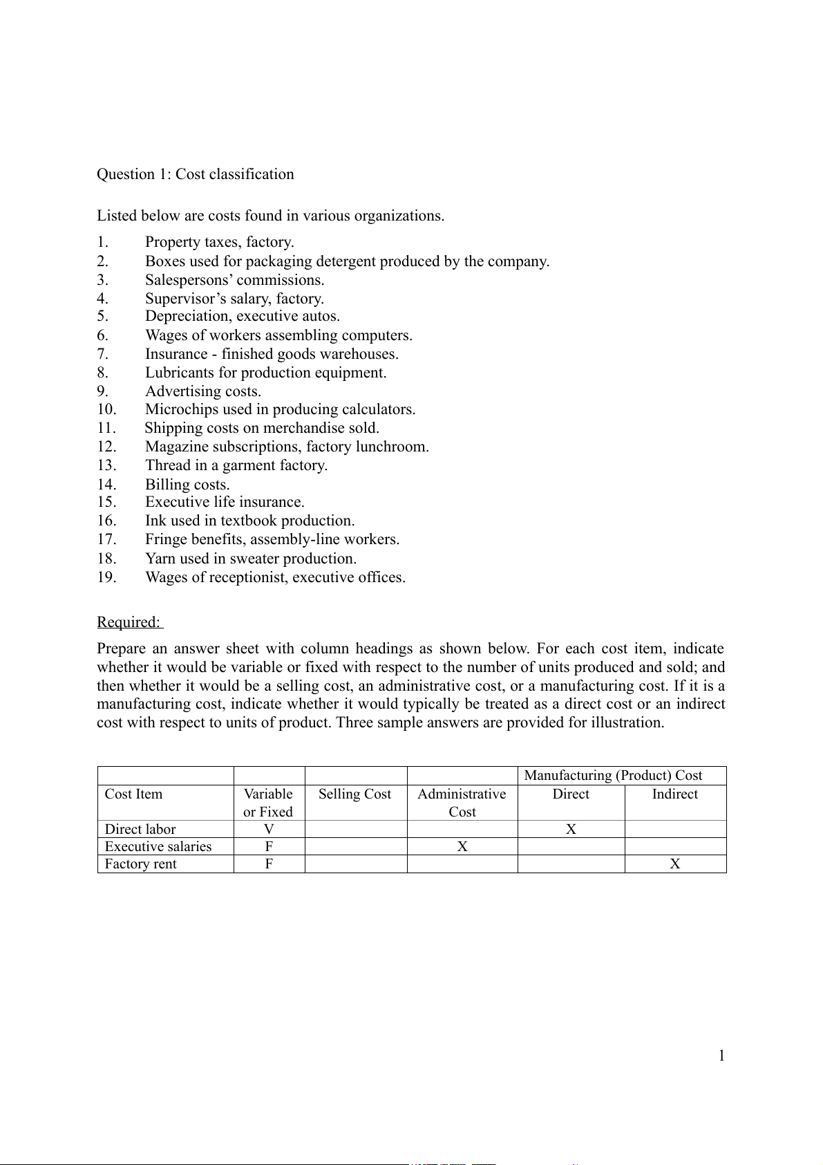 cost with respect to units of product. Three sample answers are provided for illustration. Manufacturing (Product) Cost Cost Item Variable Selling Cost Administrative Direct Indirect or Fixed Cost Direct labor V X Executive salaries F X Factory rent F X 1