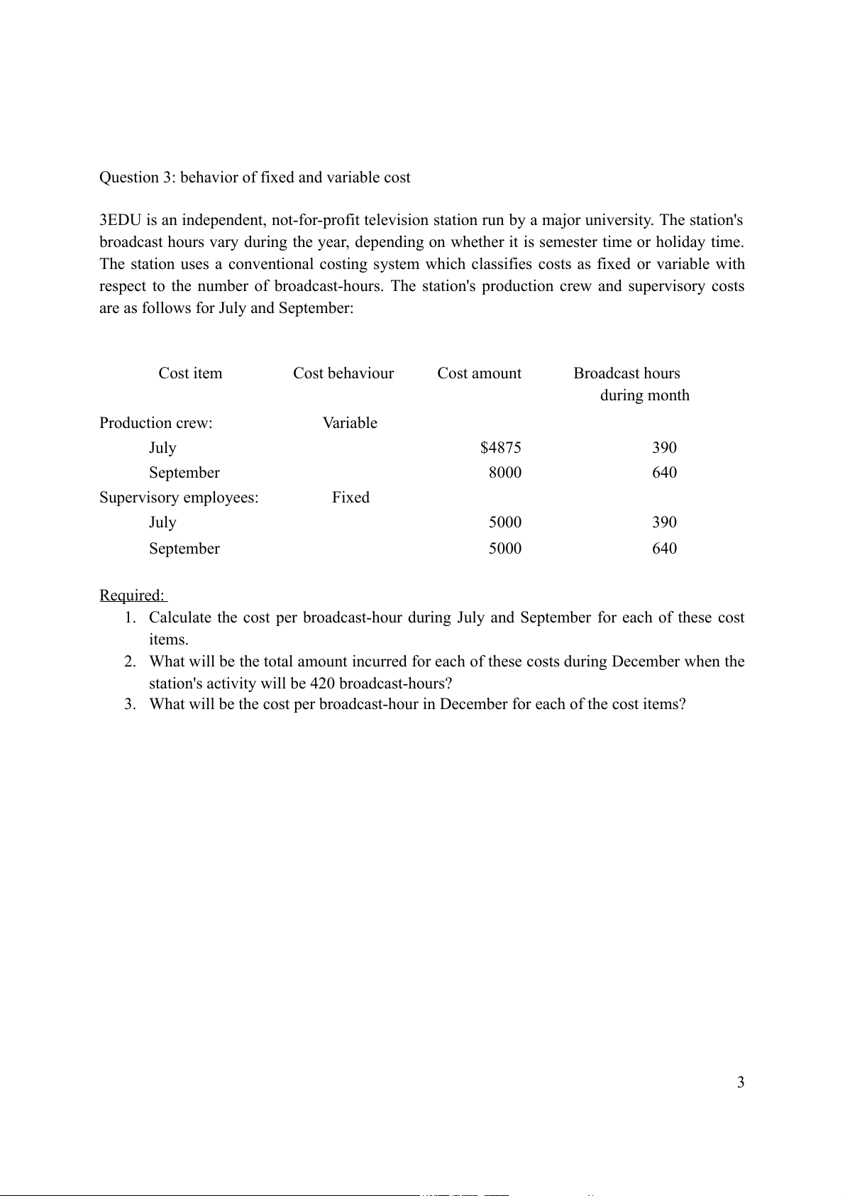 are as follows for July and September: Cost item Cost behaviour Cost amount Broadcast hours during month Production crew: Variable July $4875 390 September 8000 640 Supervisory employees: Fixed July 5000 390 September 5000 640 Required: