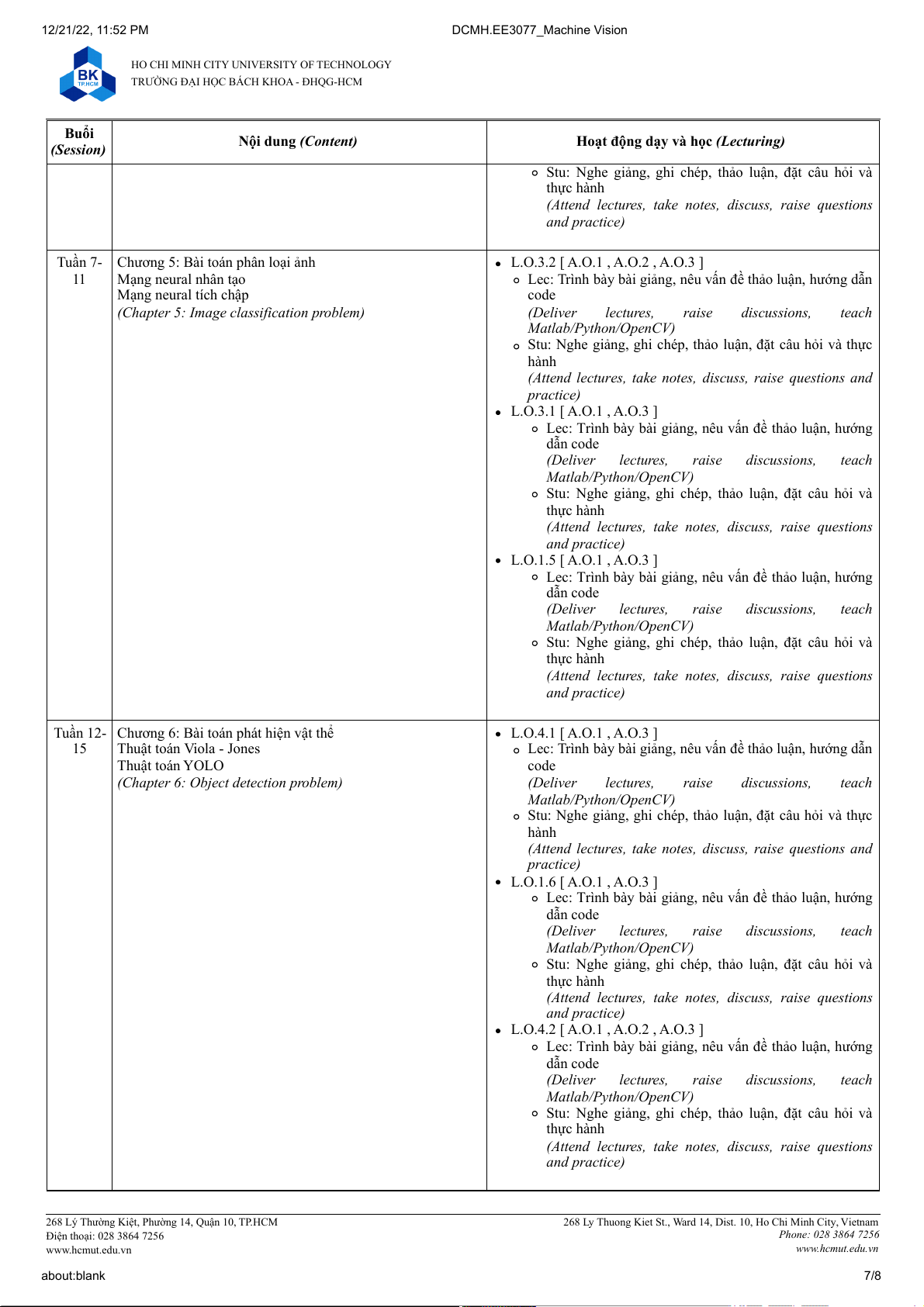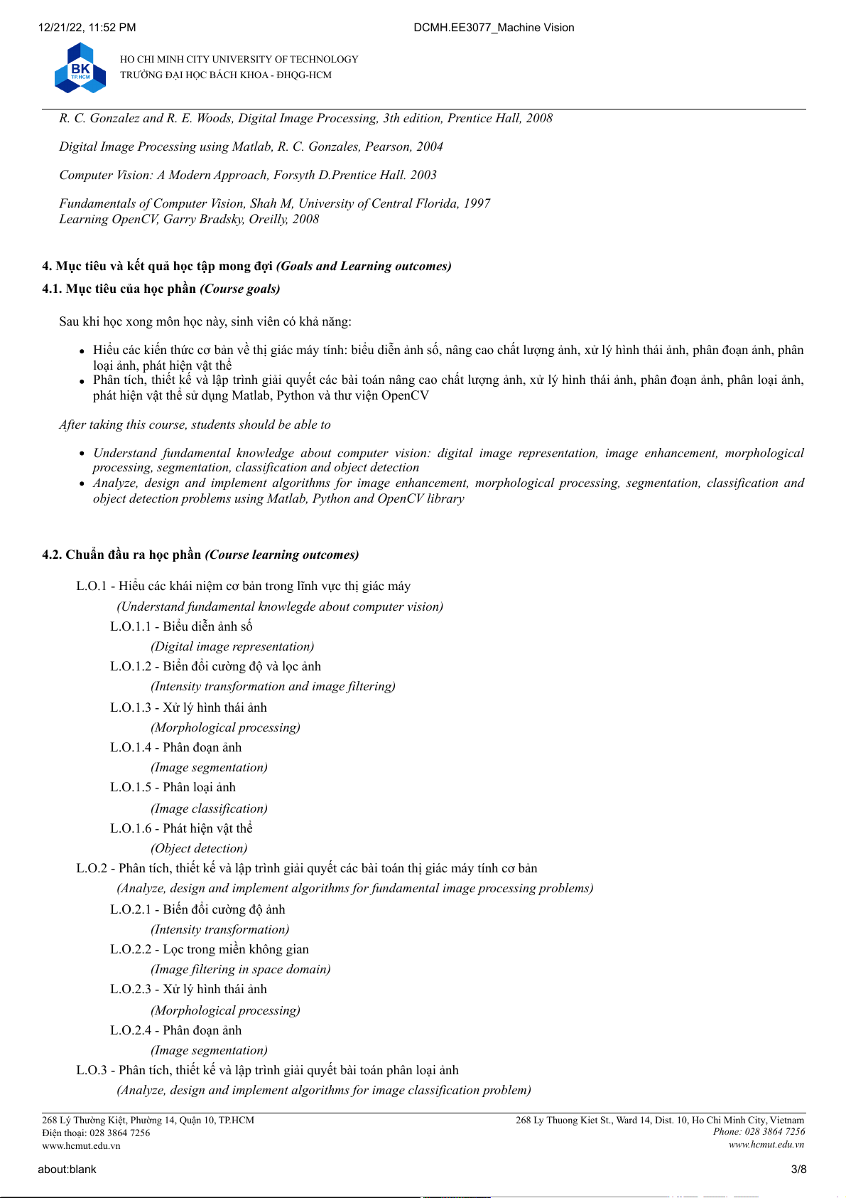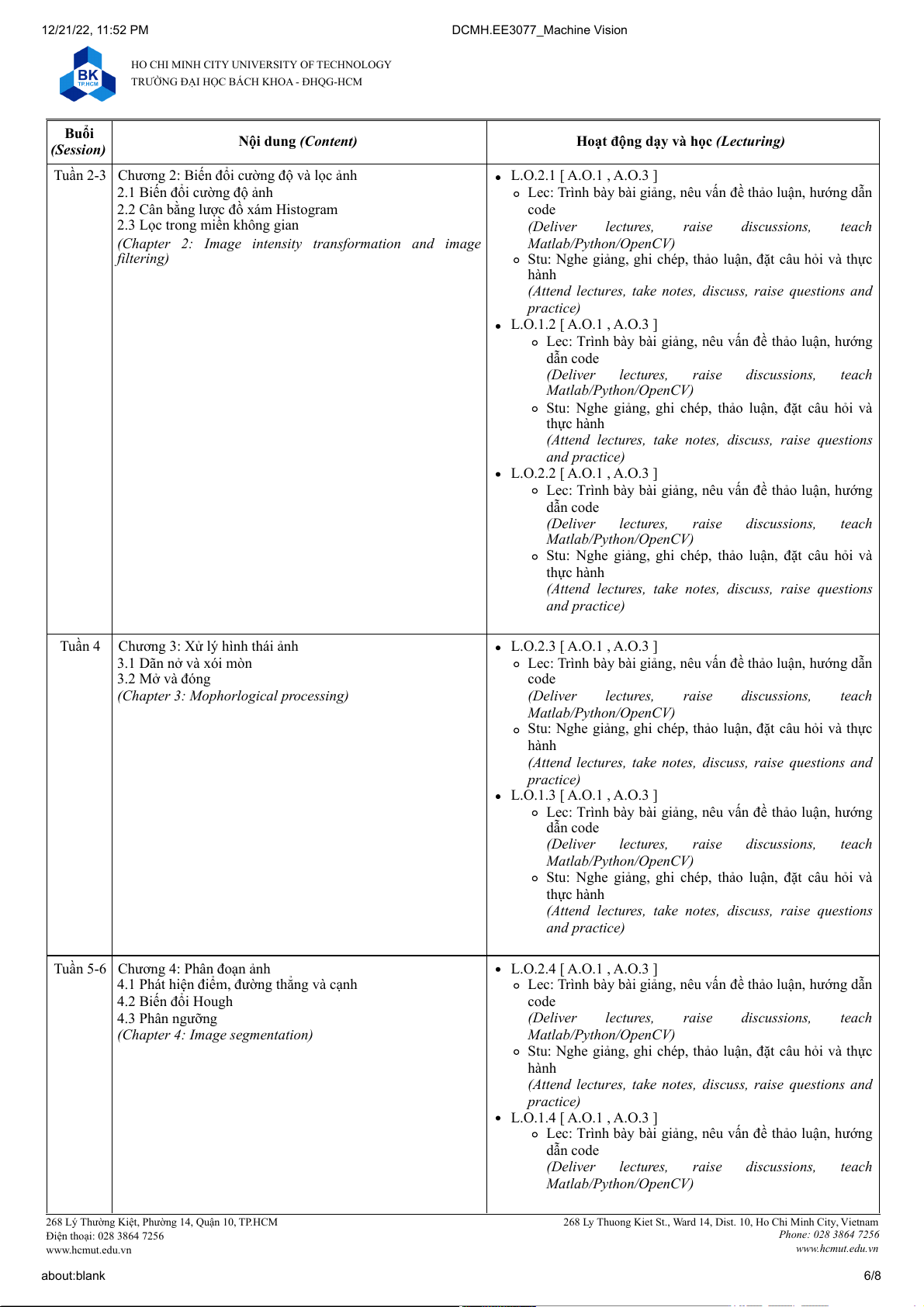 268 Ly Thuong Kiet St., Ward 14, Dist. 10, Ho Chi Minh City, Vietnam Điện thoại: 028 3864 7256 Phone: 028 3864 7256 www.hcmut.edu.vn www.hcmut.edu.vn about:blank 2/8 12/21/22, 11:52 PM DCMH.EE3077_Machine Vision