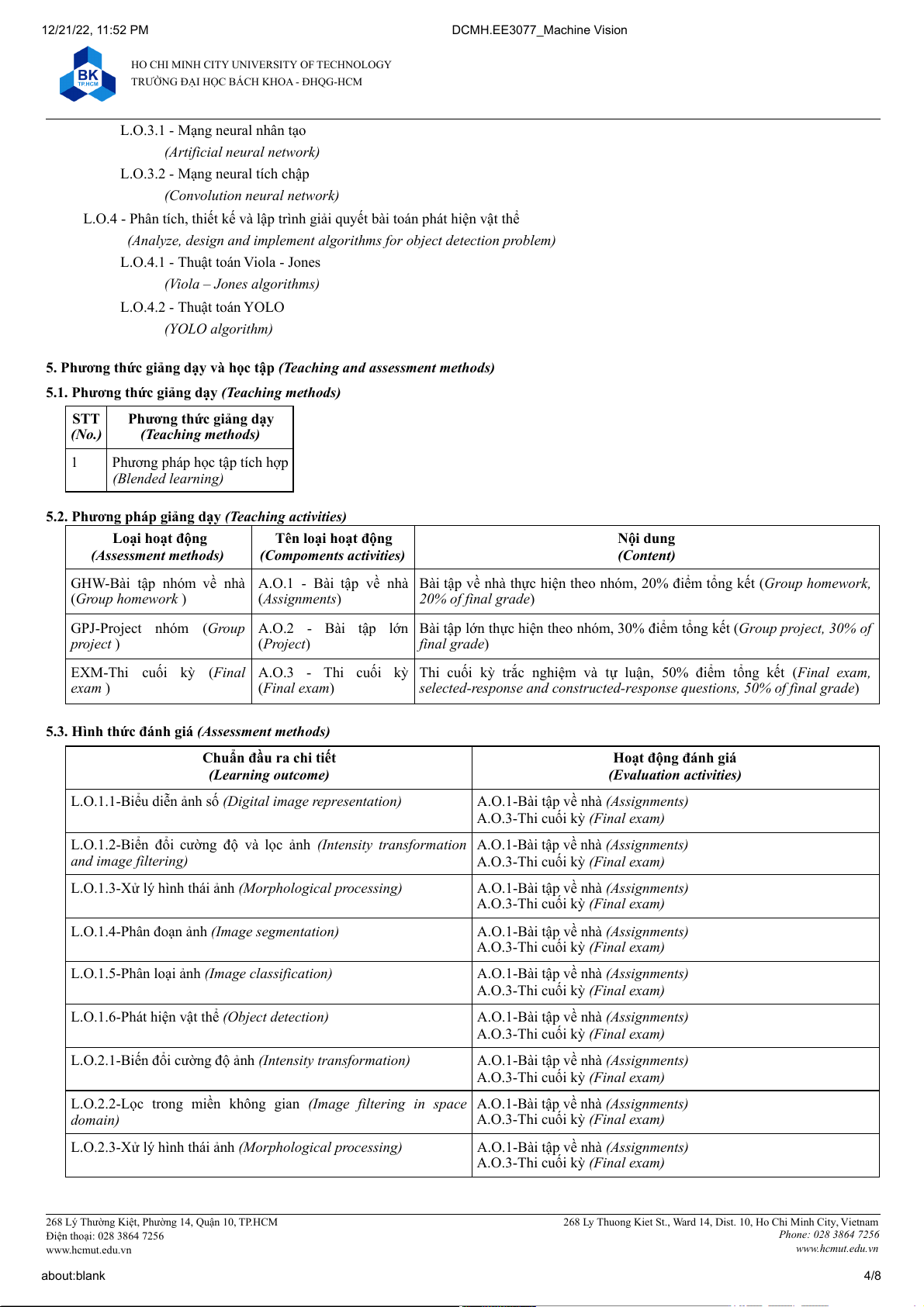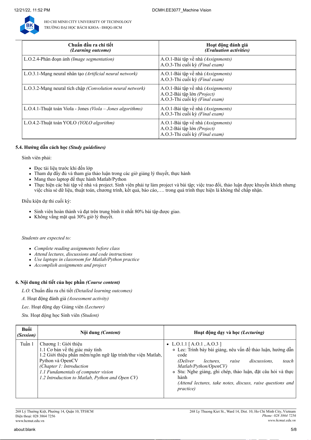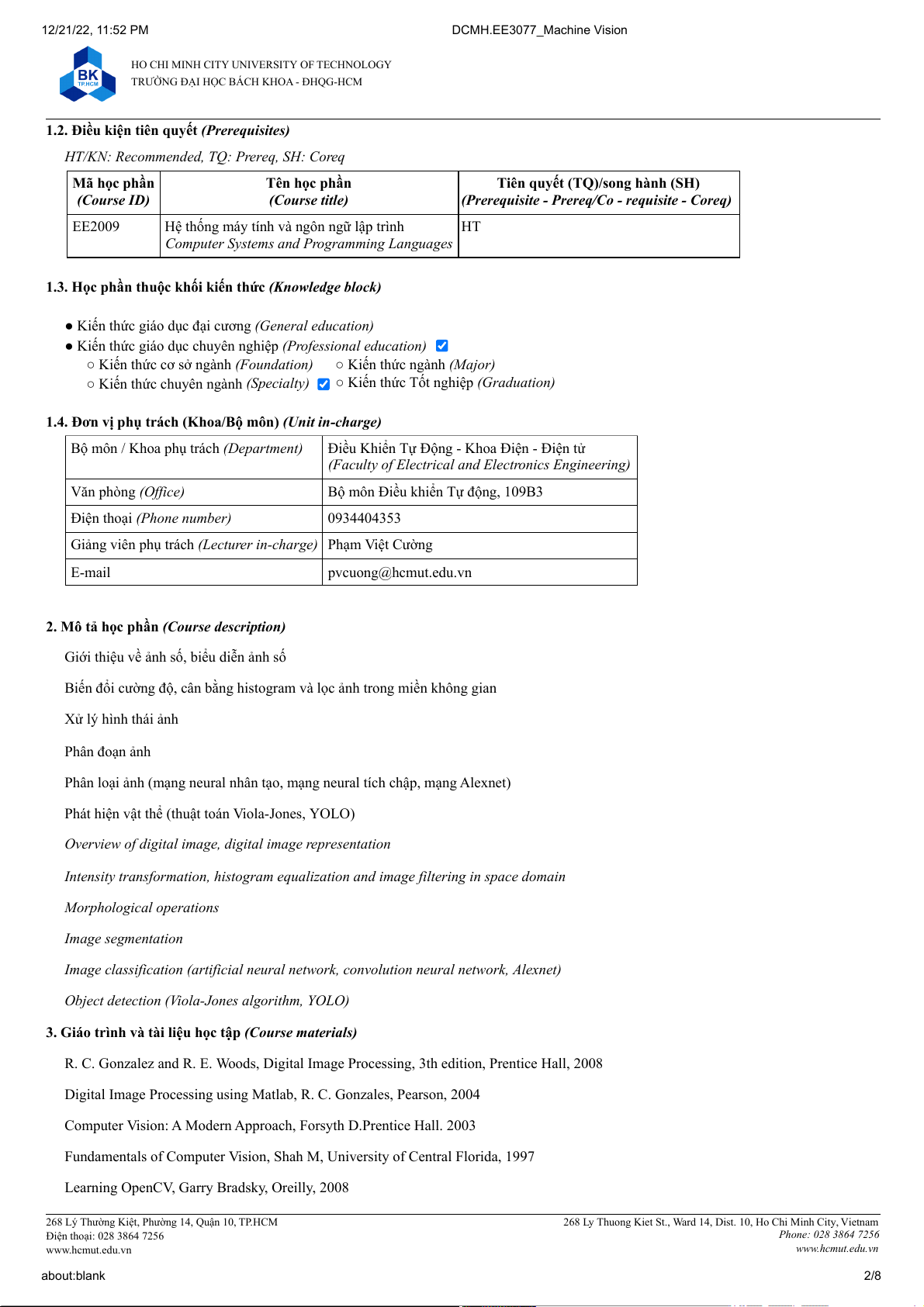 268 Ly Thuong Kiet St., Ward 14, Dist. 10, Ho Chi Minh City, Vietnam Điện thoại: 028 3864 7256 Phone: 028 3864 7256 www.hcmut.edu.vn www.hcmut.edu.vn about:blank 2/8 12/21/22, 11:52 PM DCMH.EE3077_Machine Vision