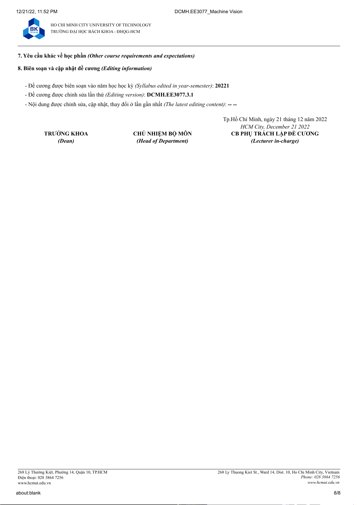 268 Ly Thuong Kiet St., Ward 14, Dist. 10, Ho Chi Minh City, Vietnam Điện thoại: 028 3864 7256 Phone: 028 3864 7256 www.hcmut.edu.vn www.hcmut.edu.vn about:blank 8/8