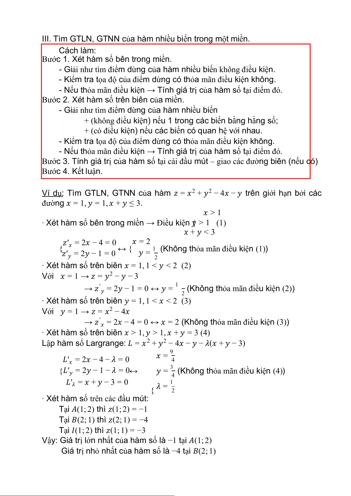 III. Tìm GTLN, GTNN của hàm nhiều biến trong một miền. Cách làm: