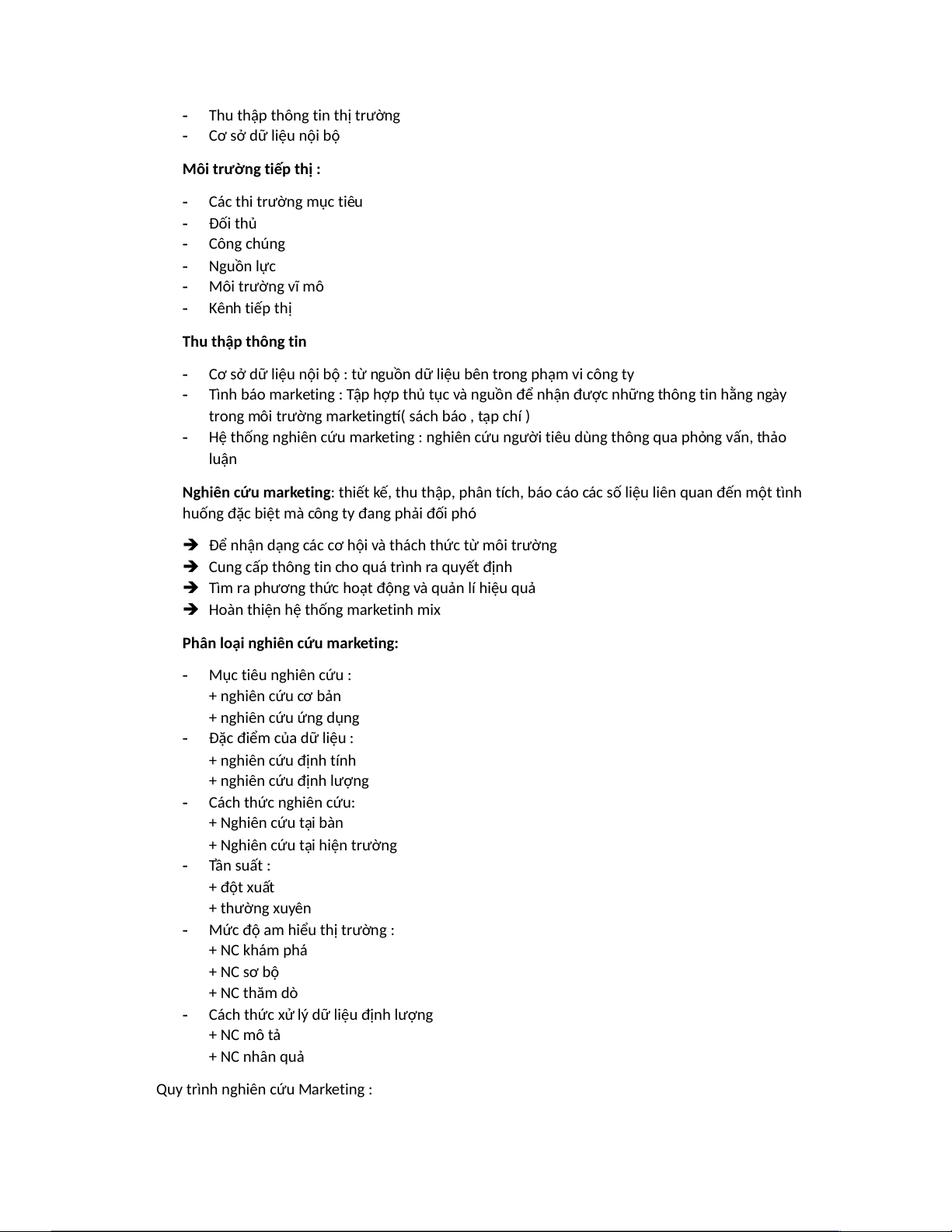 Môi trường tiếp thị : - Các thi trường mục tiêu - Đối thủ - Công chúng - Nguồn lực - Môi trường vĩ mô - Kênh tiếp thị Thu thập thông tin -
