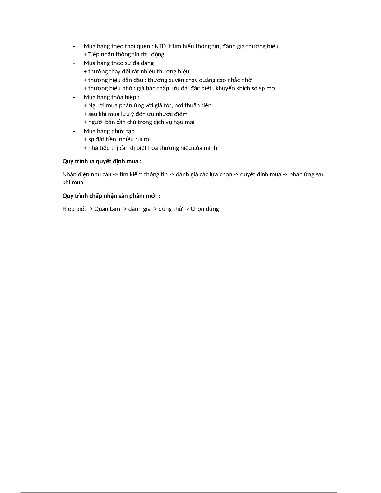 Nhận diện nhu cầu -> tìm kiếm thông tin -> đánh giá các lựa chọn -> quyết định mua -> phản ứng sau khi mua