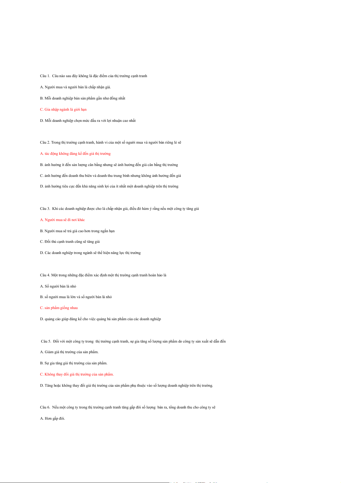 Câu 1. Câu nào sau đây không là đặc điểm của thị trường cạnh tranh