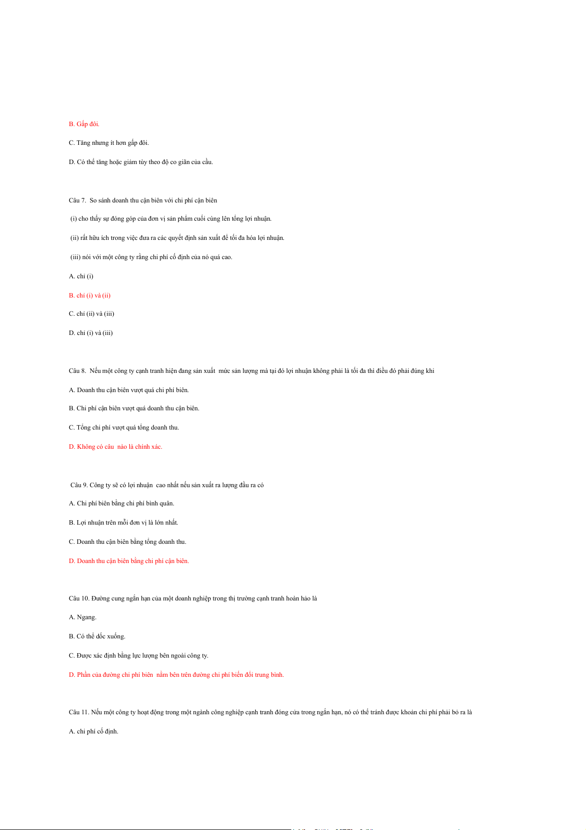 Câu 6. Nếu một công ty trong thị trường cạnh tranh tăng gấp đôi số lượng bán ra, tổng doanh thu cho công ty sẽ A. Hơn gấp đôi. B. Gấp đôi.