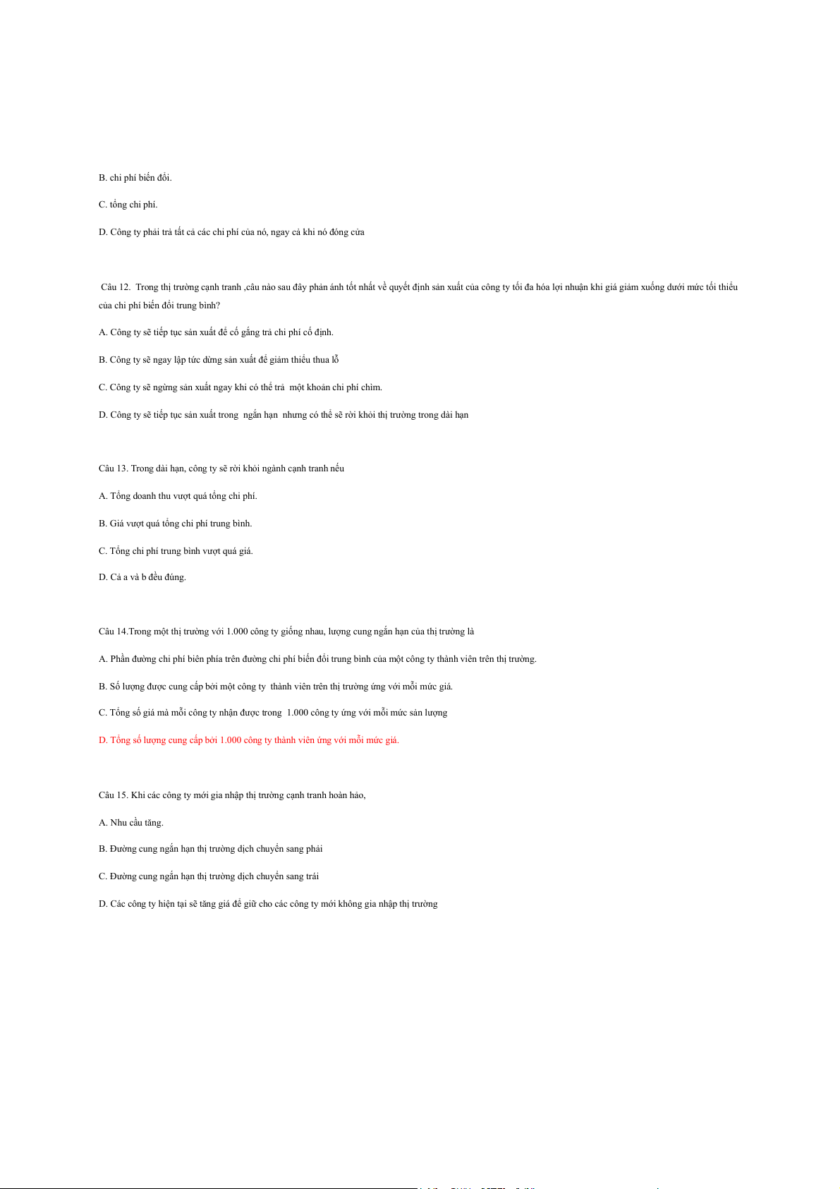 Câu 11. Nếu một công ty hoạt động trong một ngành công nghiệp cạnh tranh đóng cửa trong ngắn hạn, nó có thể tránh được khoản chi phí phải bỏ ra là A. chi phí cố định. B. chi phí biến đổi. C. tổng chi phí.