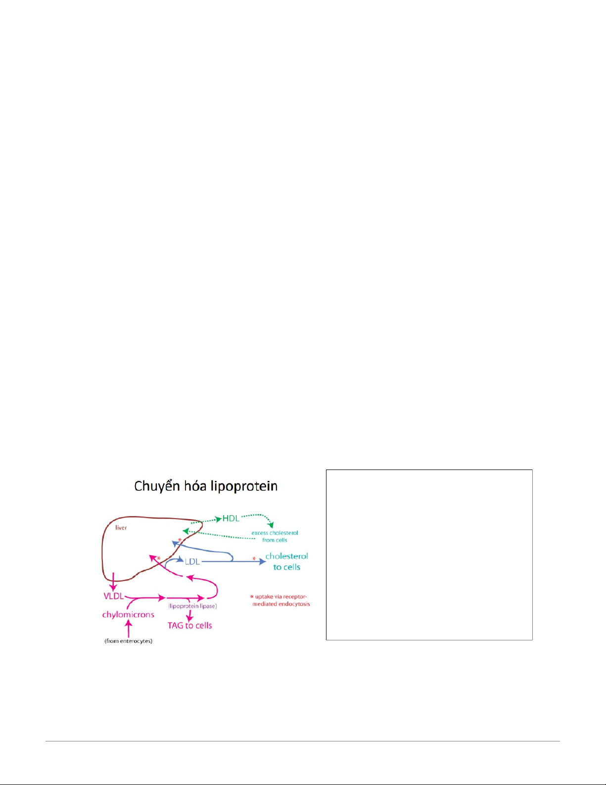 VLDL: Vận chuyển triglycerid nội sinh từ gan đến mô ngoại biên.