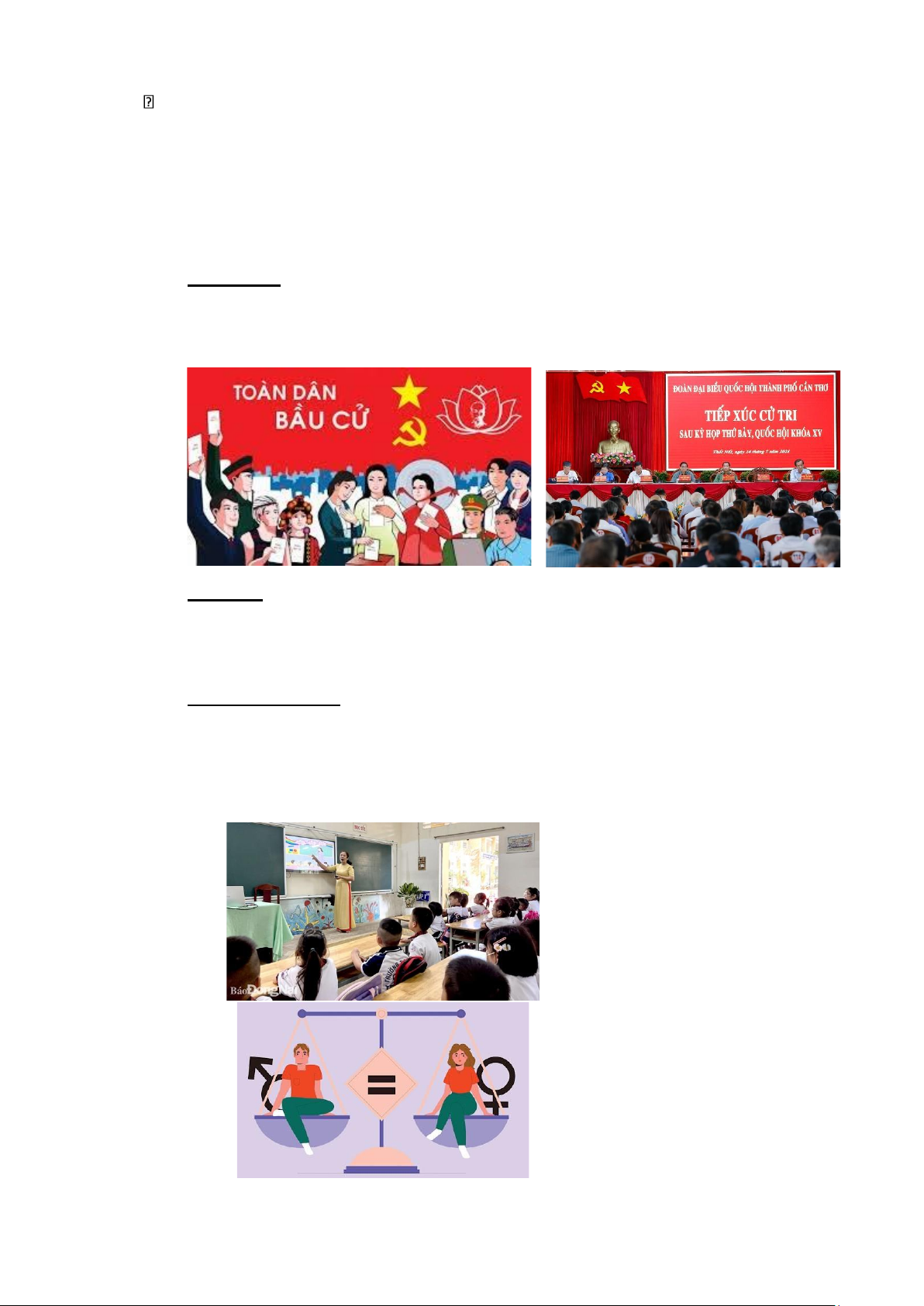 • Chính trị: Quyền bầu cử (từ 18 tuổi) và ứng cử vào Quốc hội, Hội đồng nhân
