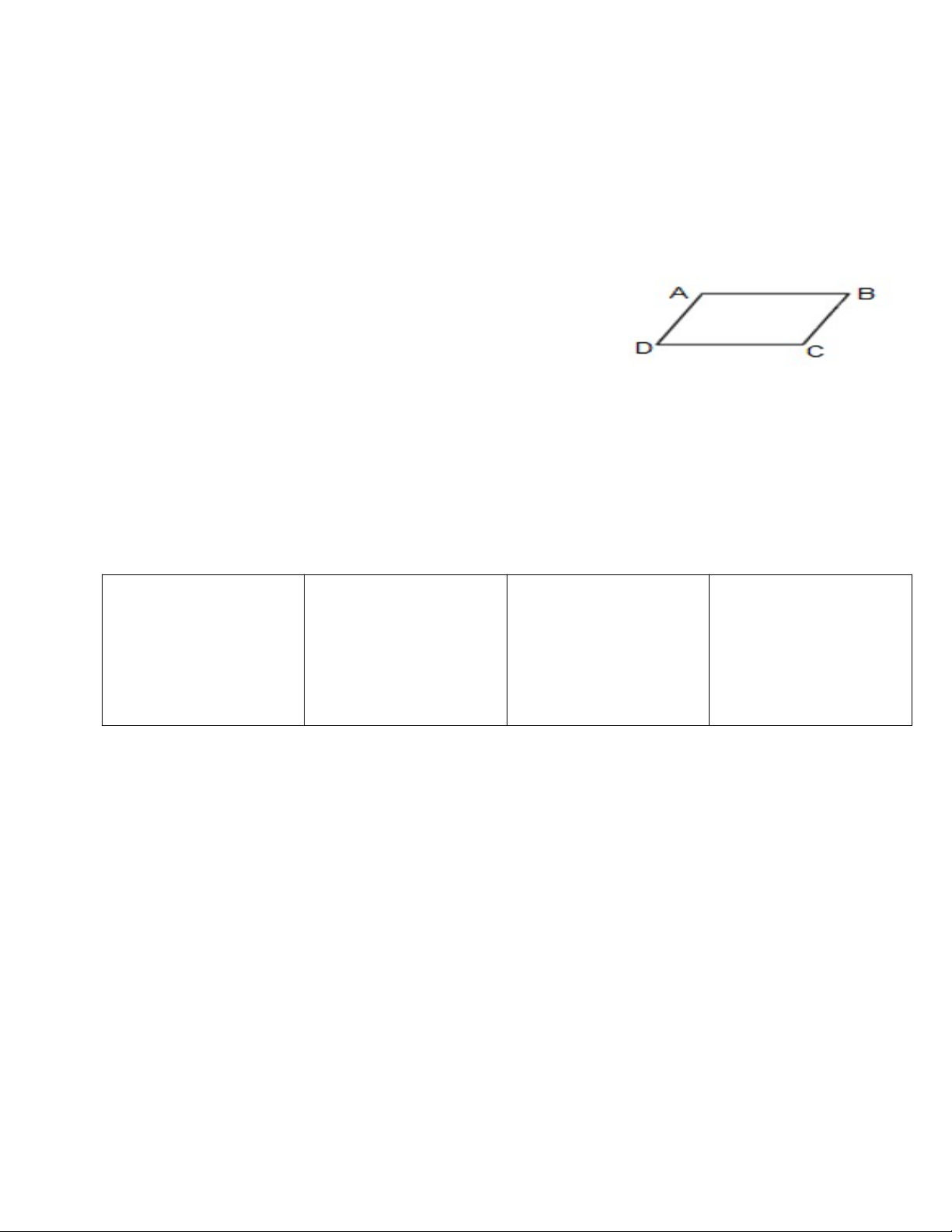 Câu 10. Cho hình bình hành ABCD ( Hình 3), cặp cạnh bằng nhau là: A. AB và AD. B. AD và DC. C. BC và AB. D. AB và DC. |