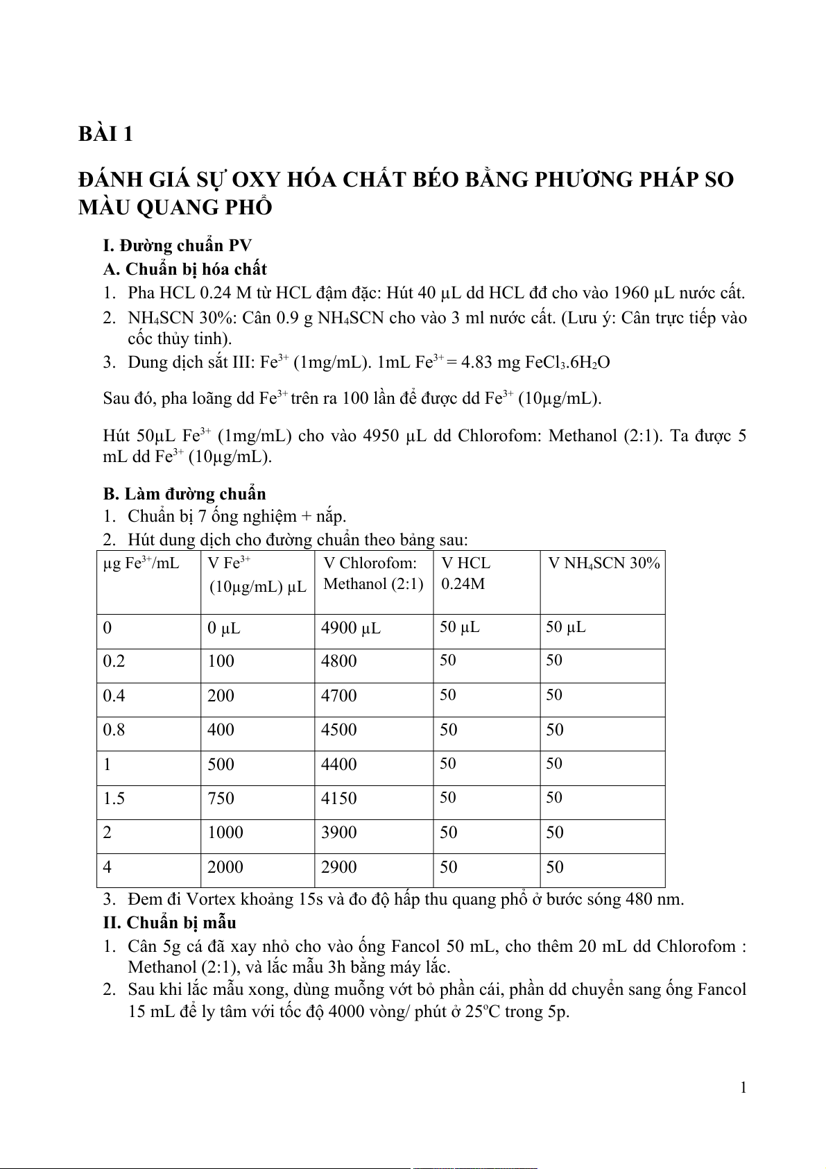 ĐÁNH GIÁ SỰ OXY HÓA CHẤT BÉO BẰNG PHƯƠNG PHÁP SO MÀU QUANG PHỔ I. Đường chuẩn PV A. Chuẩn bị hóa chất