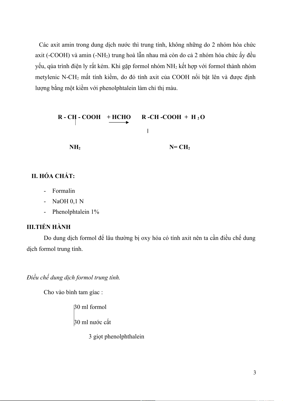R - CH - COOH + HCHO R -CH -COOH + H 2 O NH2 N= CH2 II. HÓA CHẤT: - Formalin - NaOH 0,1 N - Phenolphtalein 1% III.TIẾN HÀNH