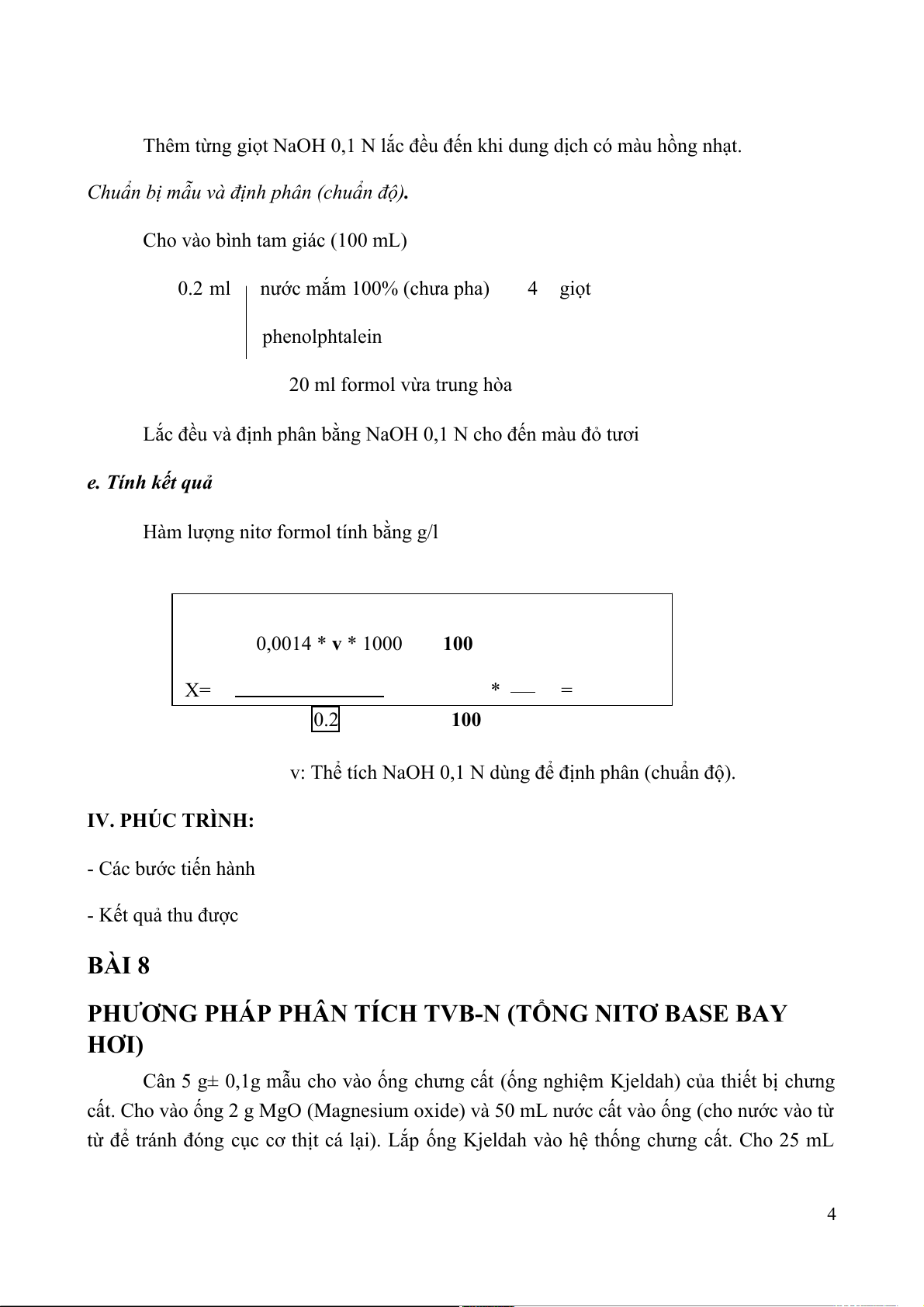 v: Thể tích NaOH 0,1 N dùng để định phân (chuẩn độ). IV. PHÚC TRÌNH: - Các bước tiến hành - Kết quả thu được BÀI 8