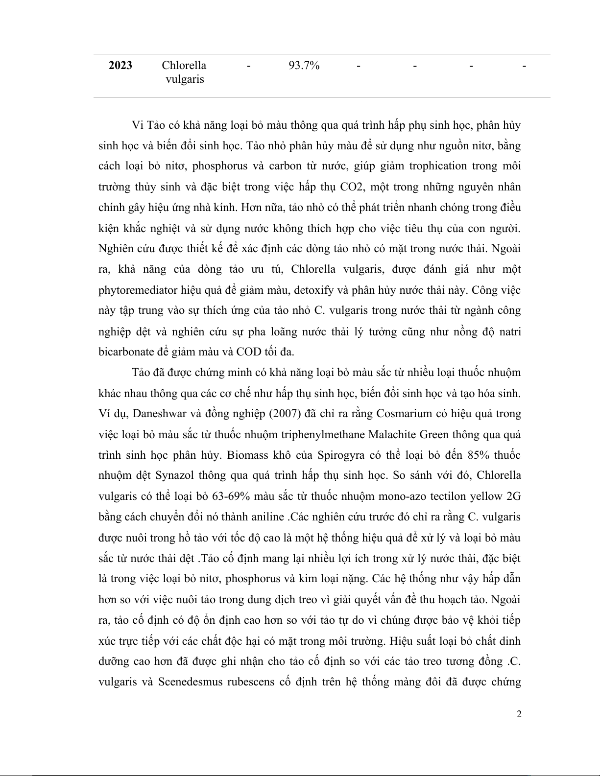 Hiệu suất loại bỏ ô nhiễm (%) (Ref) (Pt-Co) quả xử lý độ COD Nitrogen NH + 4 TP màu (%) (%) (%) (%) (%) 2008 Chlorella 500 44 - - - - vulgaris 2010 Chlorella 700- 41.8 -50 38.3– - 44.4– 33.1– vulgaris 1500 62.3 45.1 33.3 2014 Chlorella - 75 73 81 - 62 pyrenoidosa 2015 Chlorella - 58 - 83 - - - - vulgaris 2017 Chlorella 620 49.03 - - - - vulgaris 2020 Chlorella 450 93.7 - - 98.7 62.5 vulgaris 1 2023 Chlorella - 93.7% - - - - vulgaris