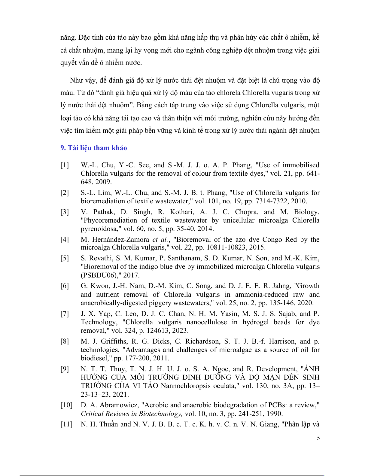 [12] N. T. Tuyền, "VI TẢO–MỘT GIẢI PHÁP TIỀM NĂNG CHO CÁC VẤN ĐỀ MÔI TRƯỜNG." 10.