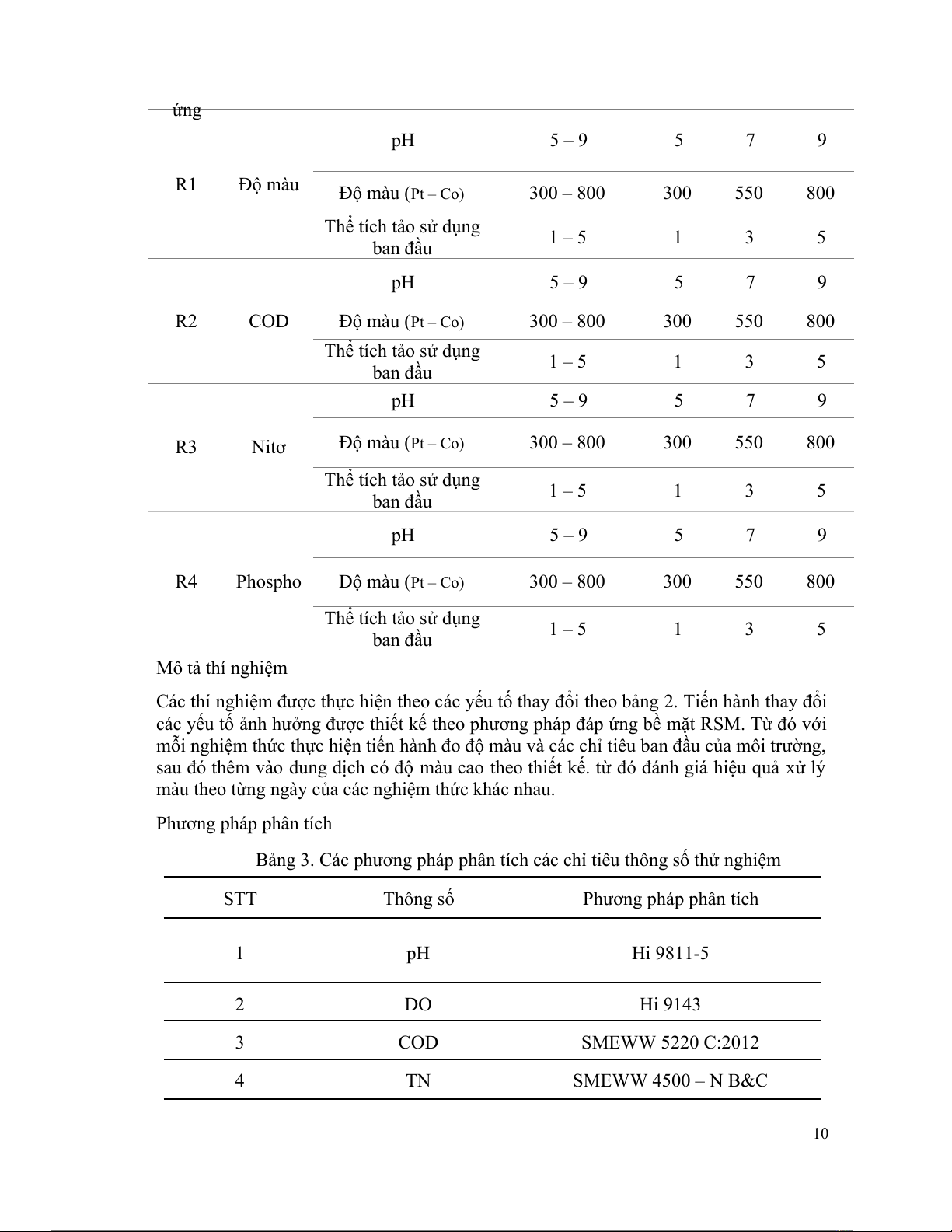 Bảng 2. Các thông sô khảo sát trong phương pháp RSM – CCD Bề mặt Chỉ tiêu Tên yếu tố Phám vi nghiên Mức đáp cứu -1 0 1 9 ứng pH 5 – 9 5 7 9 R1 Độ màu Độ màu (Pt – Co) 300 – 800 300 550 800 Thể tích tảo sử dụng 1 – 5 1 3 5 ban đầu pH 5 – 9 5 7 9 R2 COD Độ màu (Pt – Co) 300 – 800 300 550 800 Thể tích tảo sử dụng 1 – 5 1 3 5 ban đầu pH 5 – 9 5 7 9 R3 Nitơ Độ màu (Pt – Co) 300 – 800 300 550 800 Thể tích tảo sử dụng 1 – 5 1 3 5 ban đầu pH 5 – 9 5 7 9 R4 Phospho Độ màu (Pt – Co) 300 – 800 300 550 800 Thể tích tảo sử dụng 1 – 5 1 3 5 ban đầu Mô tả thí nghiệm