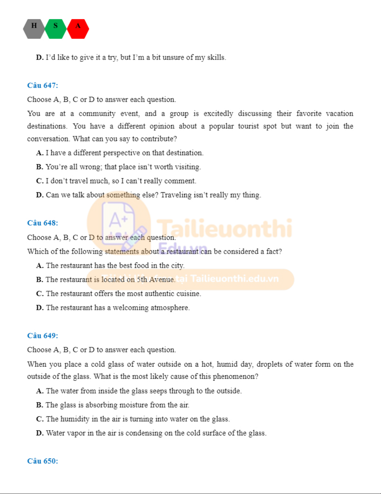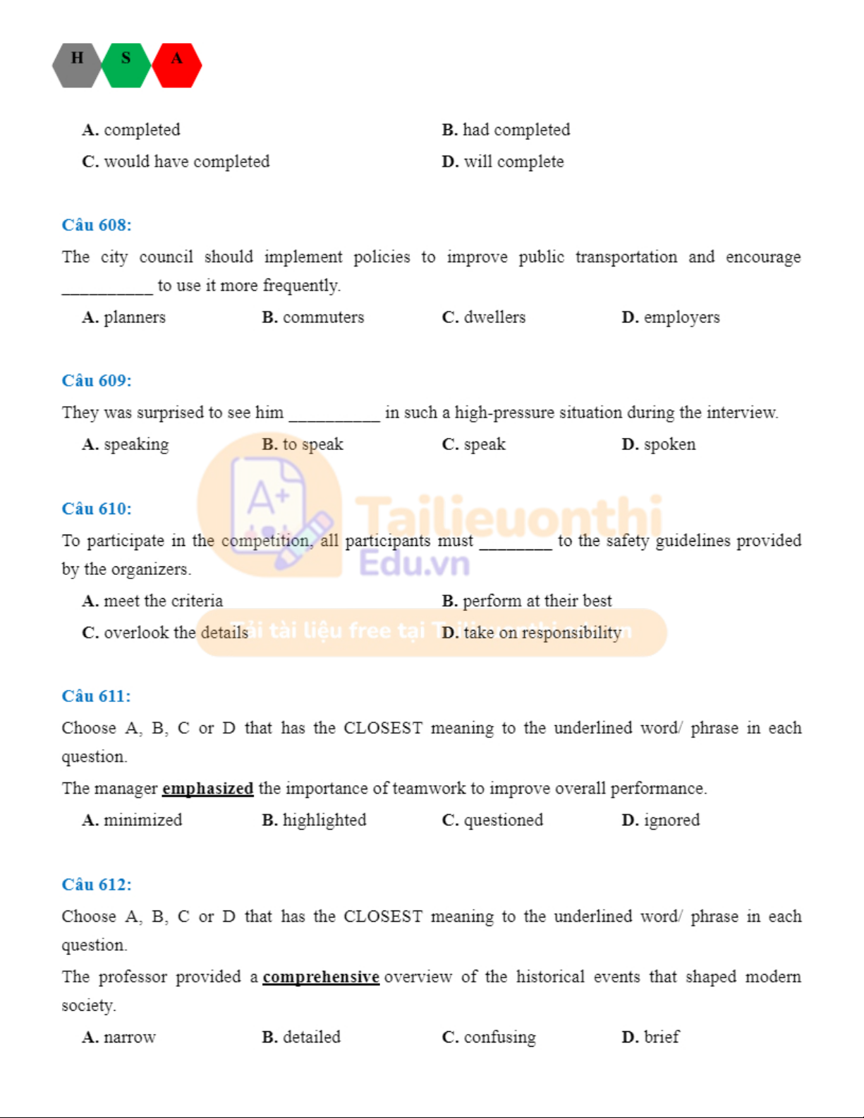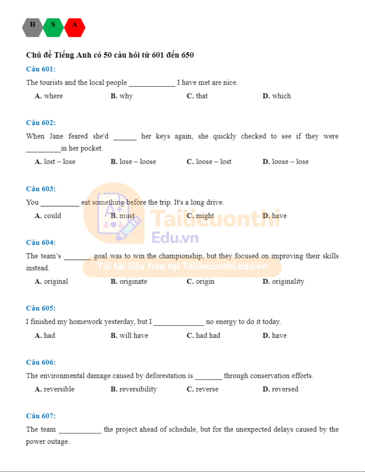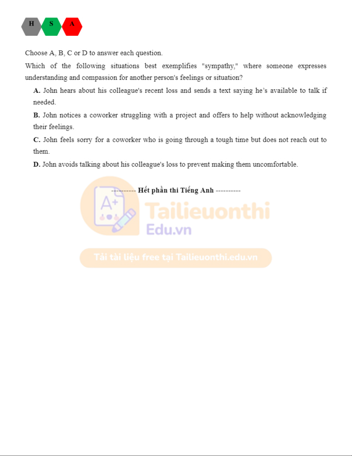 Đánh giá năng lực tiếng anh HSA. Tài liệu giúp bạn tham khảo, ôn tập và đạt kết quả cao. Mời đọc đón xem!