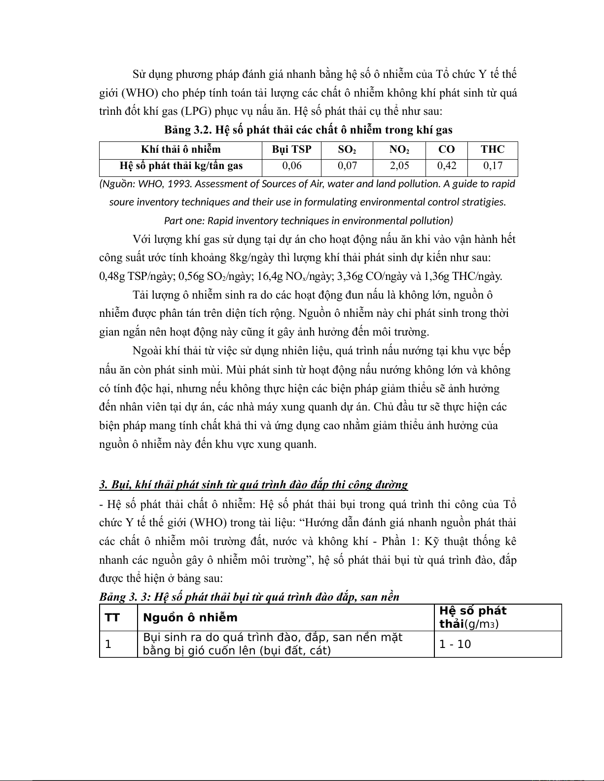 Bảng 3. 3: Hệ số phát thải bụi từ quá trình đào đắp, san nền TT Nguồn ô nhiễm Hệ số phát thải(g/m3) 1