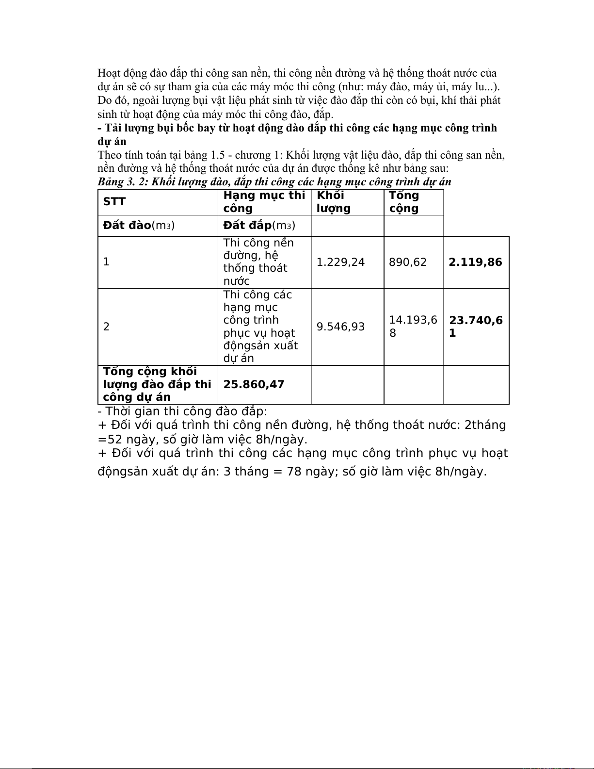 Bảng 3. 2: Khối lượng đào, đắp thi công các hạng mục công trình dự án STT