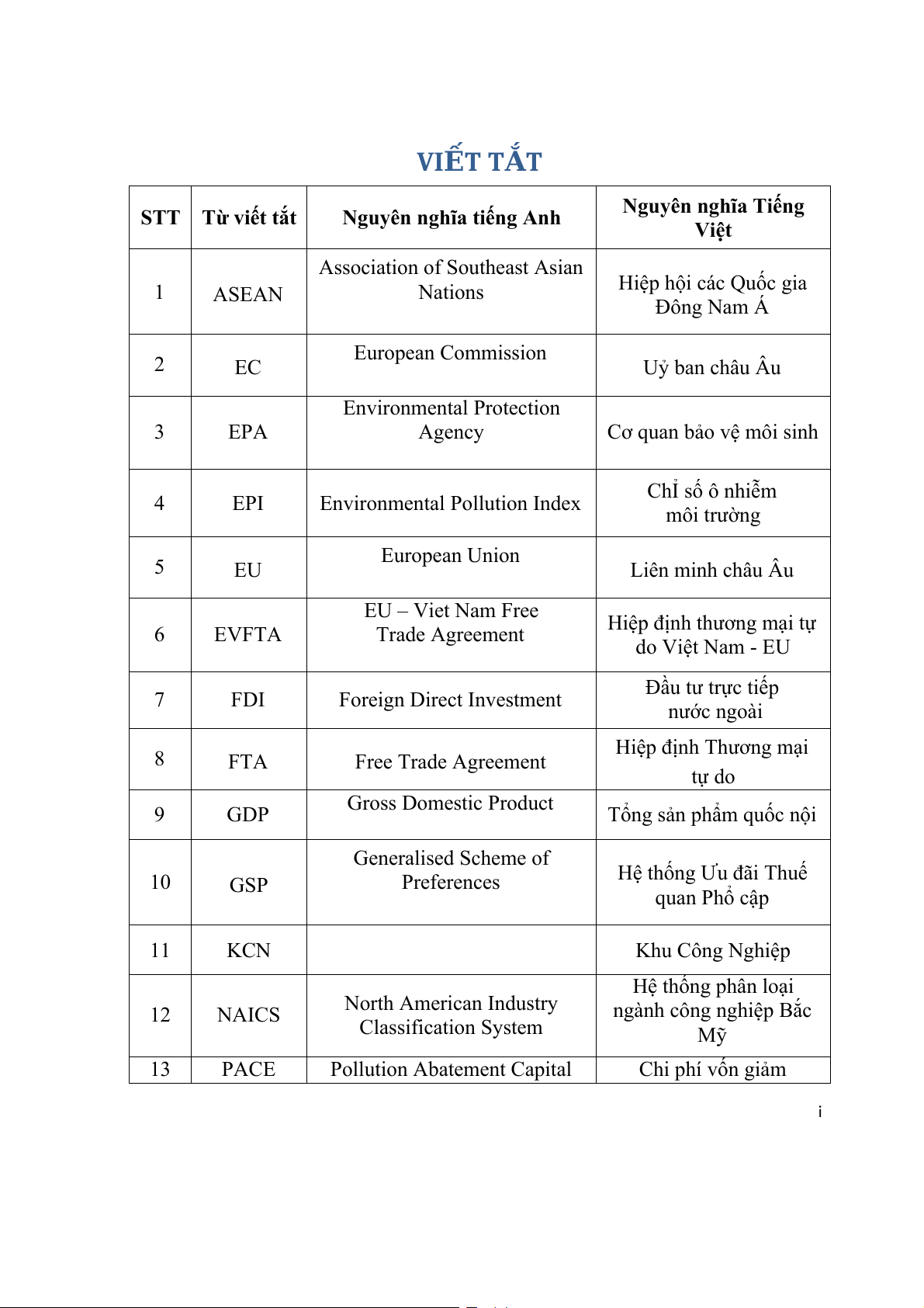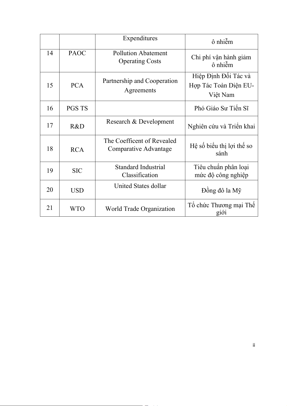 Tổng sản phẩm quốc nội Generalised Scheme of 10 GSP Preferences Hệ thống Ưu đãi Thuế quan Phổ cập 11 KCN Khu Công Nghiệp Hệ thống phân loại North American Industry 12 NAICS ngành công nghiệp Bắc Classification System Mỹ 13 PACE Pollution Abatement Capital Chi phí vốn giảm i Expenditures ô nhiễm 14 PAOC Pollution Abatement Chi phí vận hành giảm Operating Costs ô nhiễm Hiệp Định Đối Tác và Partnership and Cooperation 15 PCA Hợp Tác Toàn Diện EU- Agreements Việt Nam 16 PGS TS Phó Giáo Sư Tiến Sĩ Research & Development 17 R&D Nghiên cứu và Triển khai The Coefficent of Revealed 18 RCA Comparative Advantage