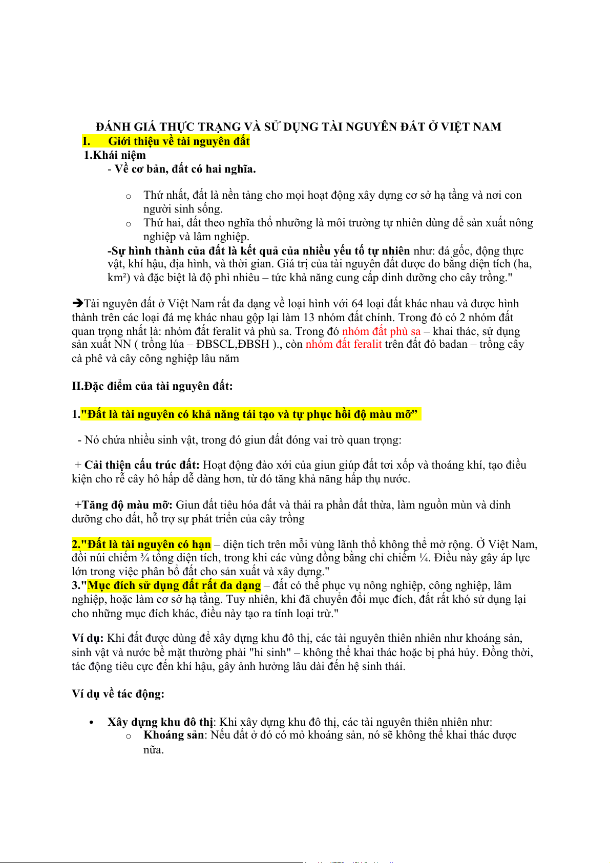 ĐÁNH GIÁ THỰC TRẠNG VÀ SỬ DỤNG TÀI NGUYÊN ĐẤT Ở VIỆT NAM I.