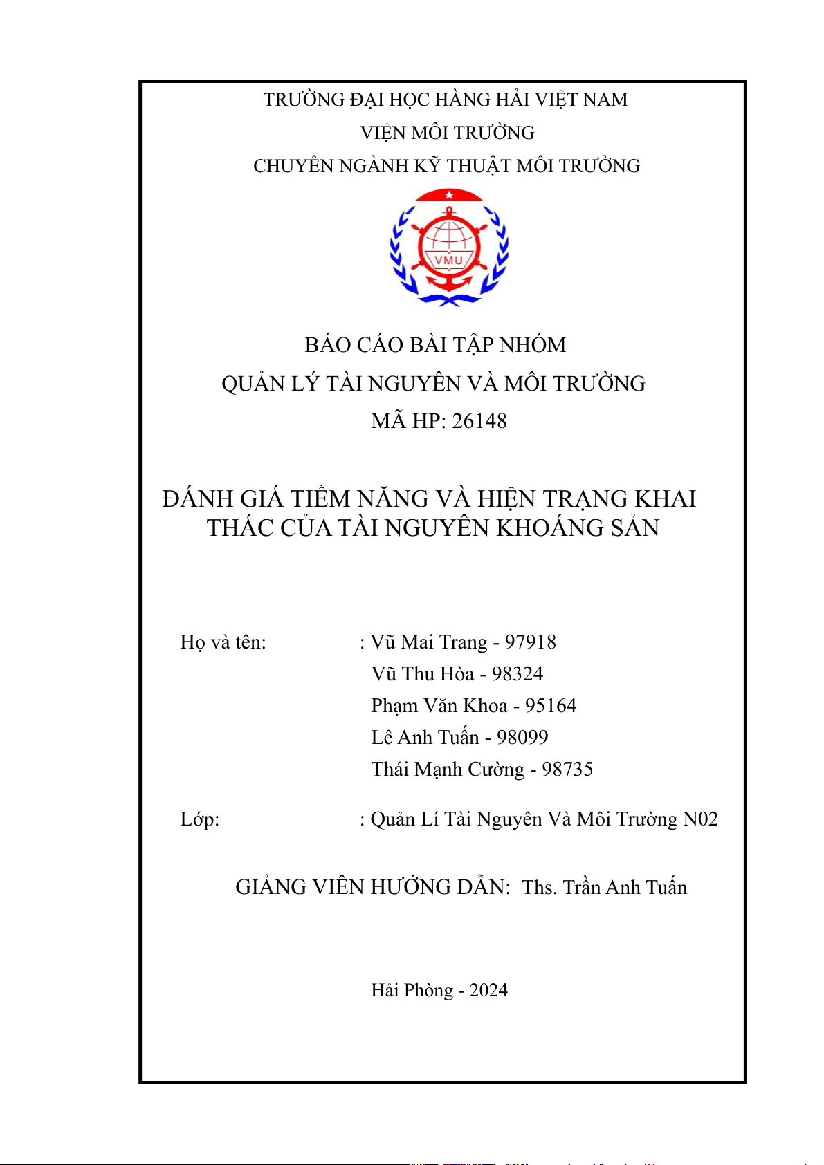 QUẢN LÝ TÀI NGUYÊN VÀ MÔI TRƯỜNG MÃ HP: 26148