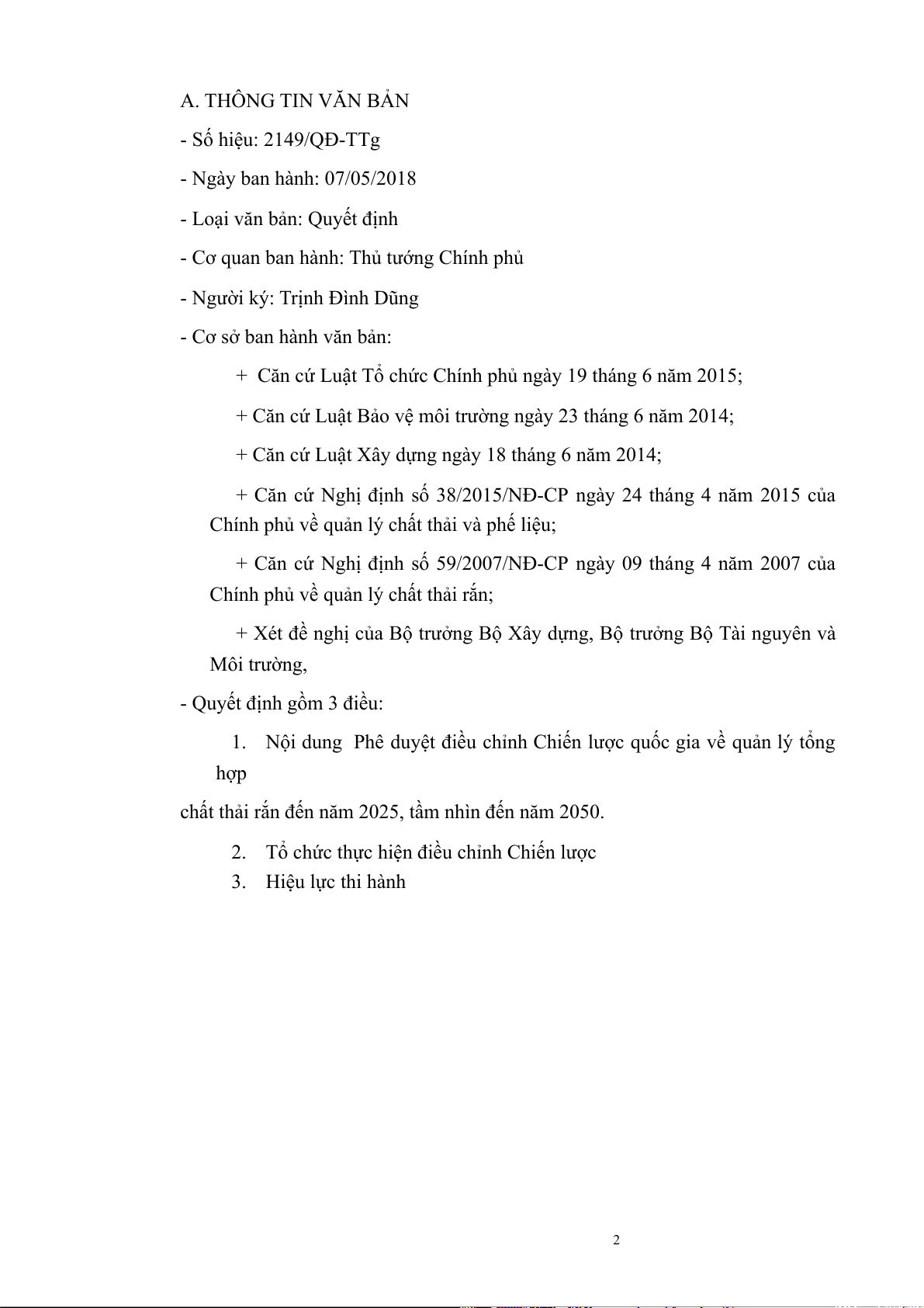 các hoạt động quản lí chất thải rắn tại Việt Nam. 1 A. THÔNG TIN VĂN BẢN - Số hiệu: 2149/QĐ-TTg - Ngày ban hành: 07/05/2018