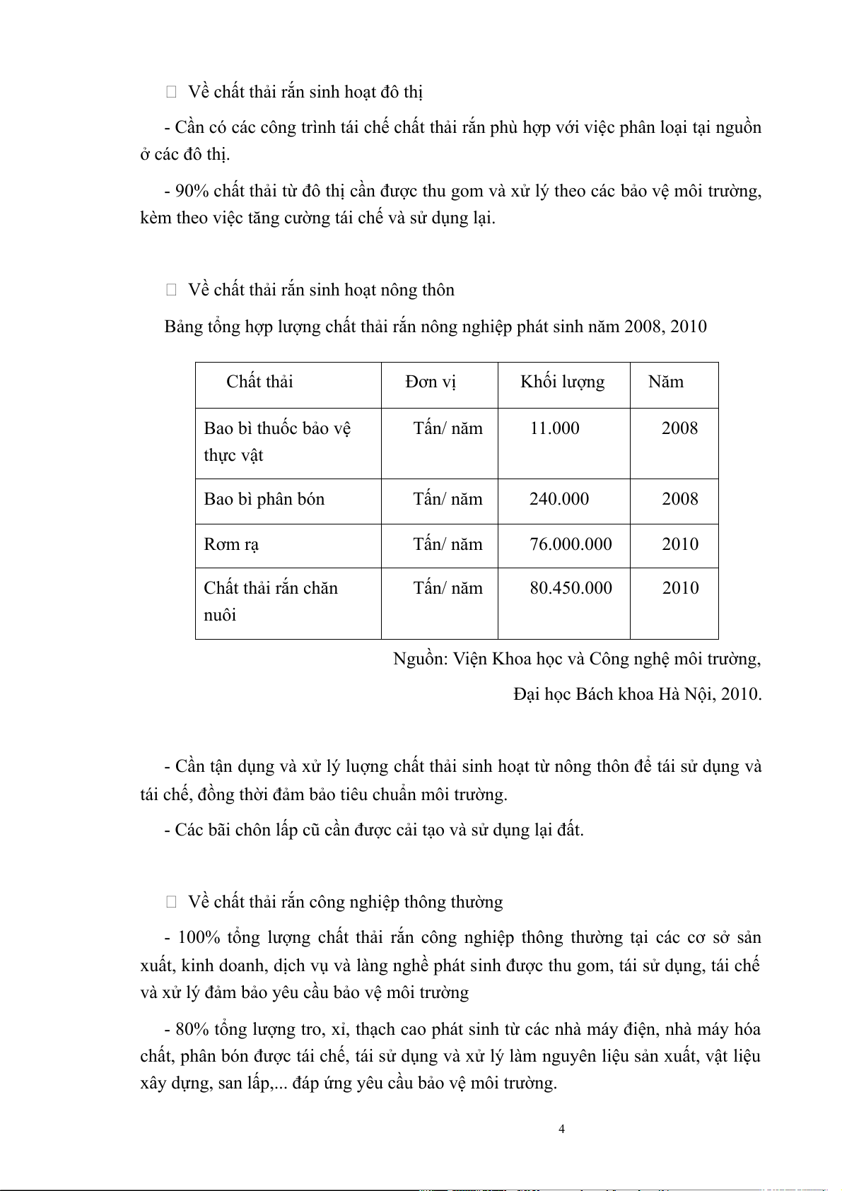 Bảng tổng hợp lượng chất thải rắn nông nghiệp phát sinh năm 2008, 2010 Chất thải Đơn vị Khối lượng Năm Bao bì thuốc bảo vệ Tấn/ năm 11.000 2008 thực vật Bao bì phân bón Tấn/ năm 240.000 2008 Rơm rạ Tấn/ năm 76.000.000 2010 Chất thải rắn chăn Tấn/ năm 80.450.000 2010 nuôi