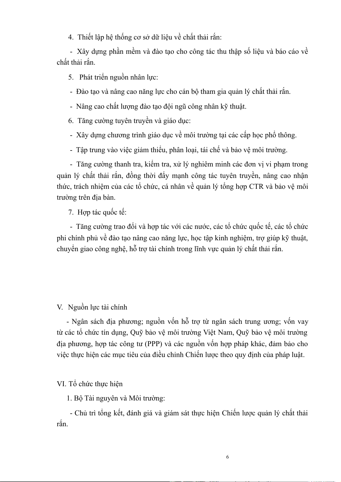 chuyển giao công nghệ, hỗ trợ tài chính trong lĩnh vực quản lý chất thải rắn. V. Nguồn lực tài chính