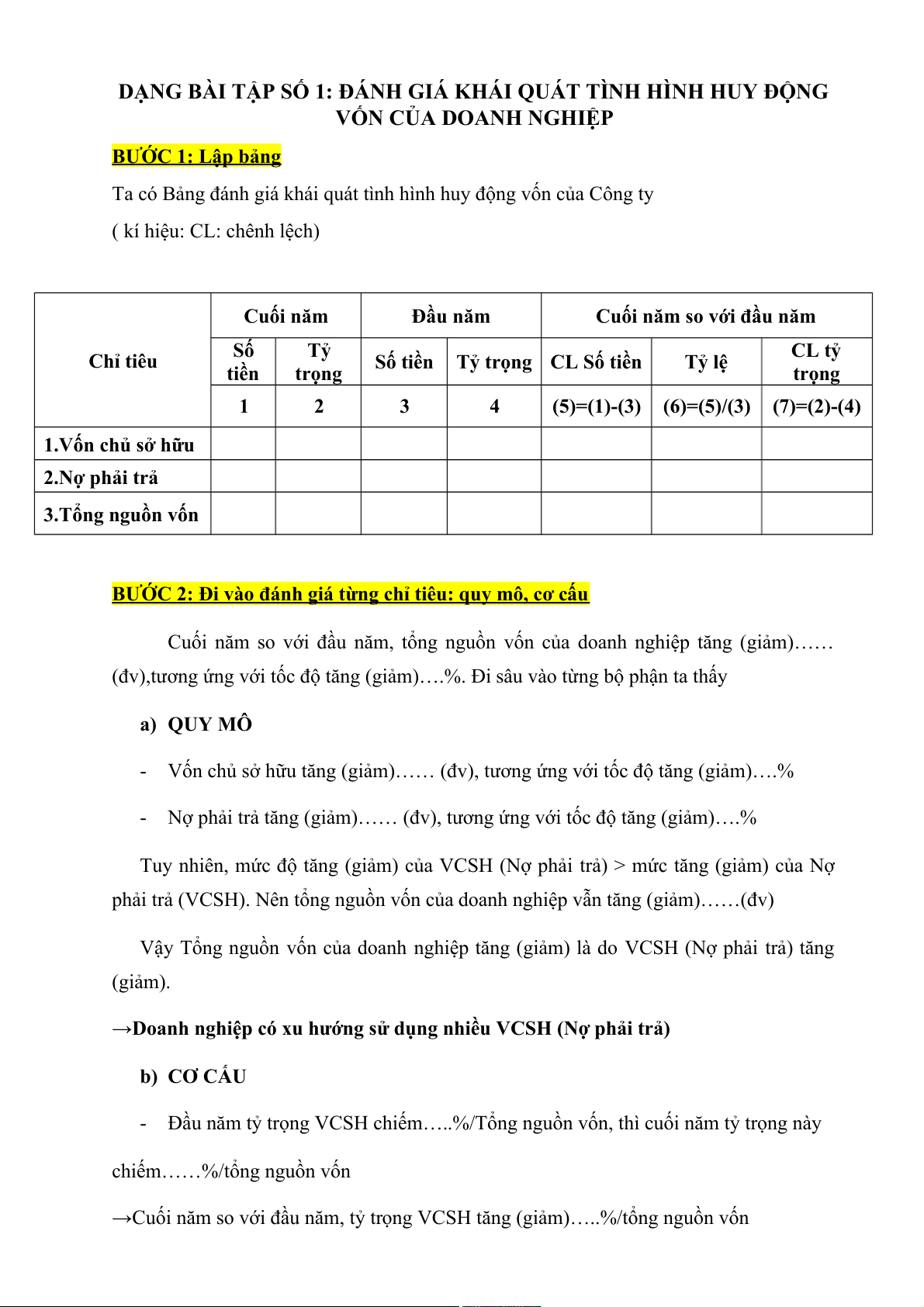 VỐN CỦA DOANH NGHIỆP BƯỚC 1: Lập bảng