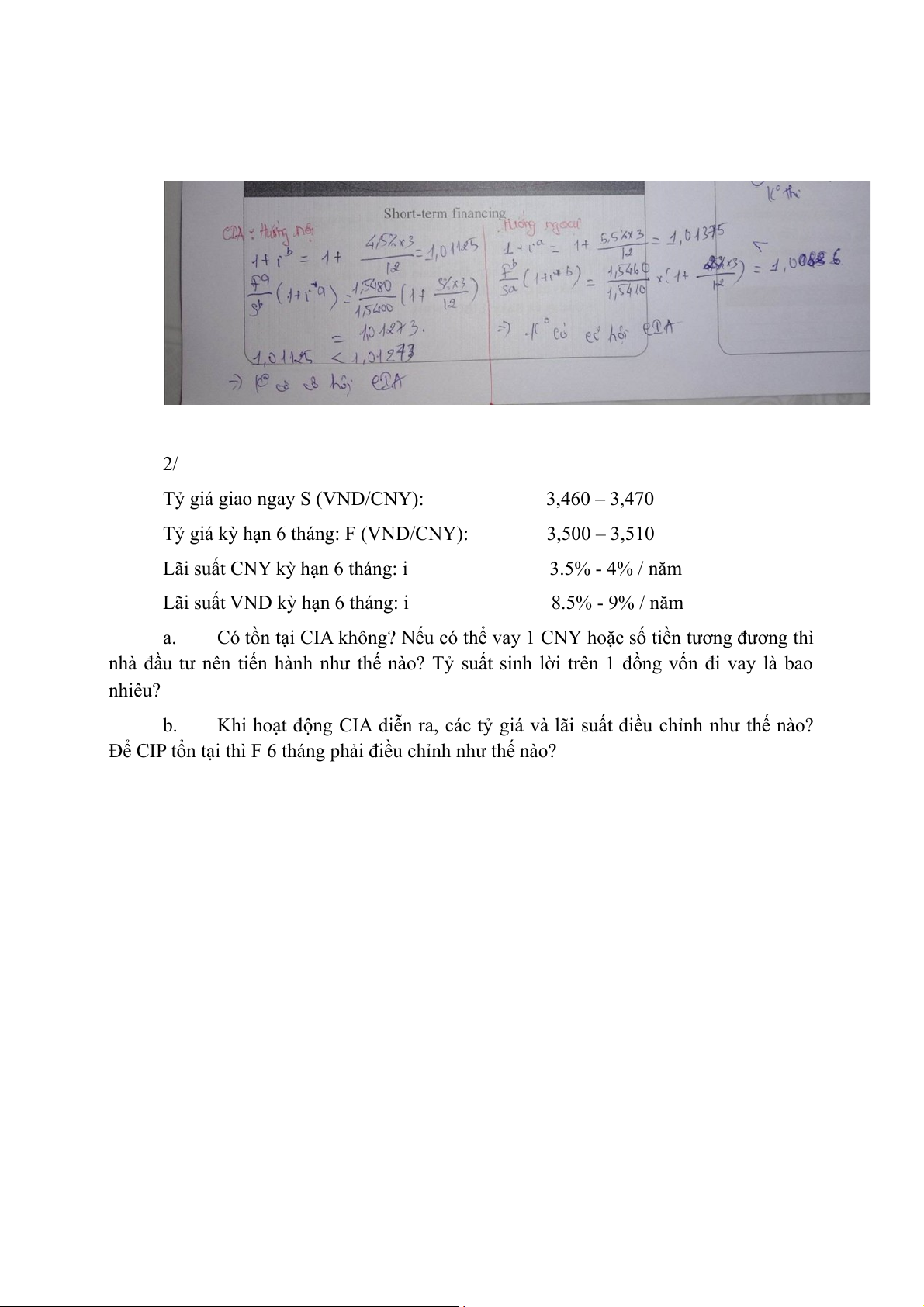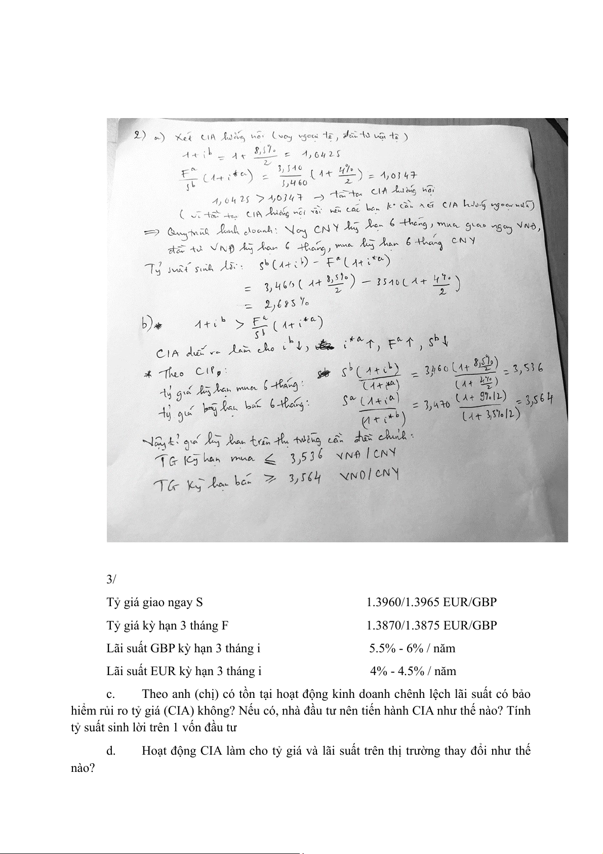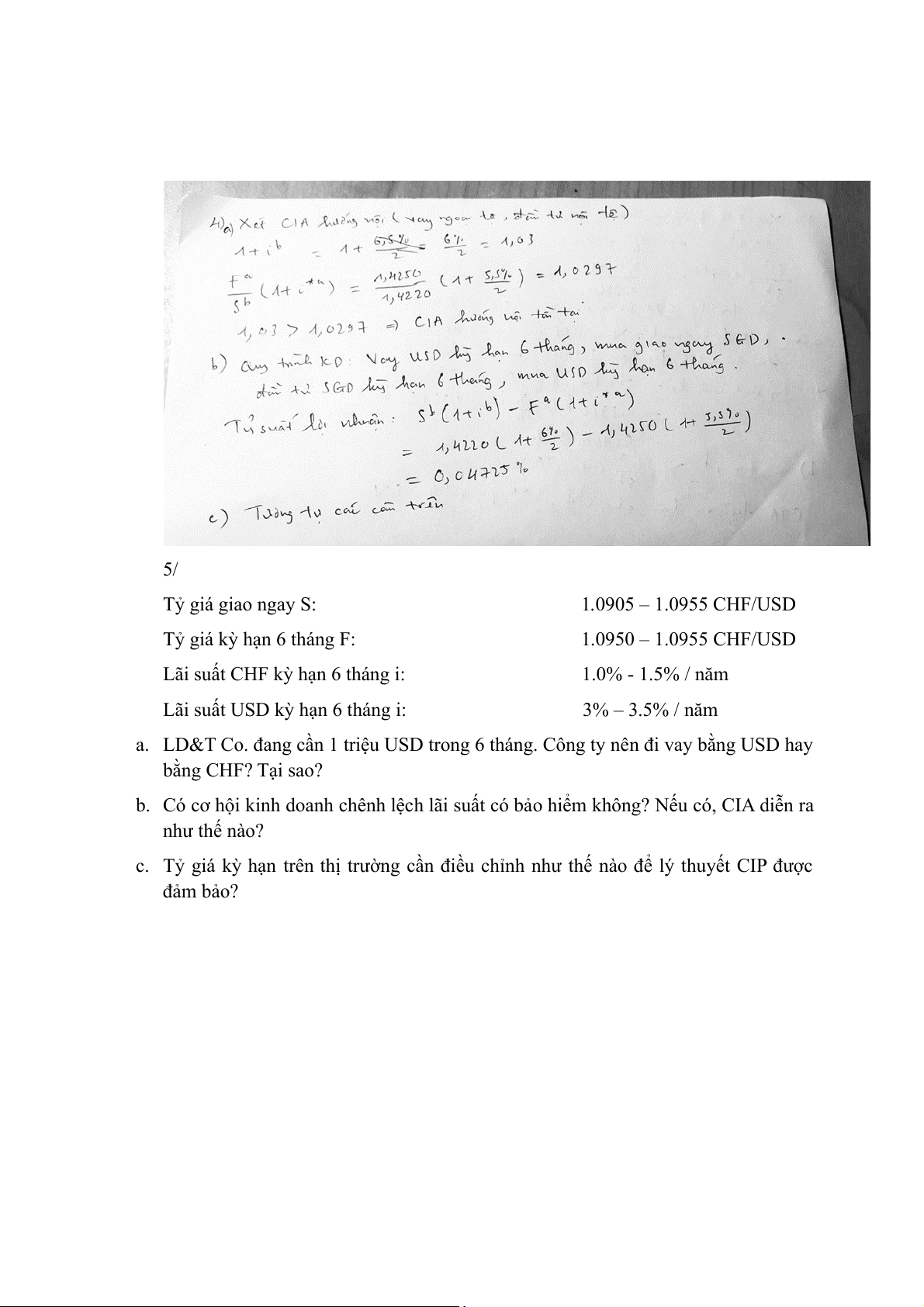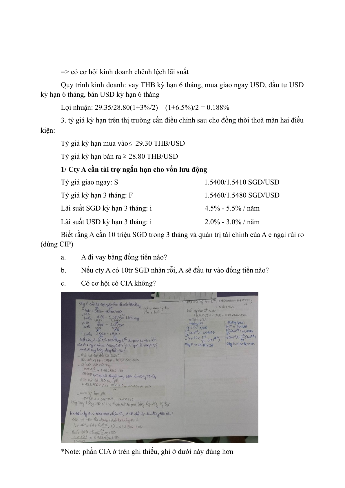 2. theo CIP, tỷ giá kỳ hạn 6 tháng mua vào = 28.60*(1+5.5%/2)/(1+3.5%/2) = 28.88 THB/USD