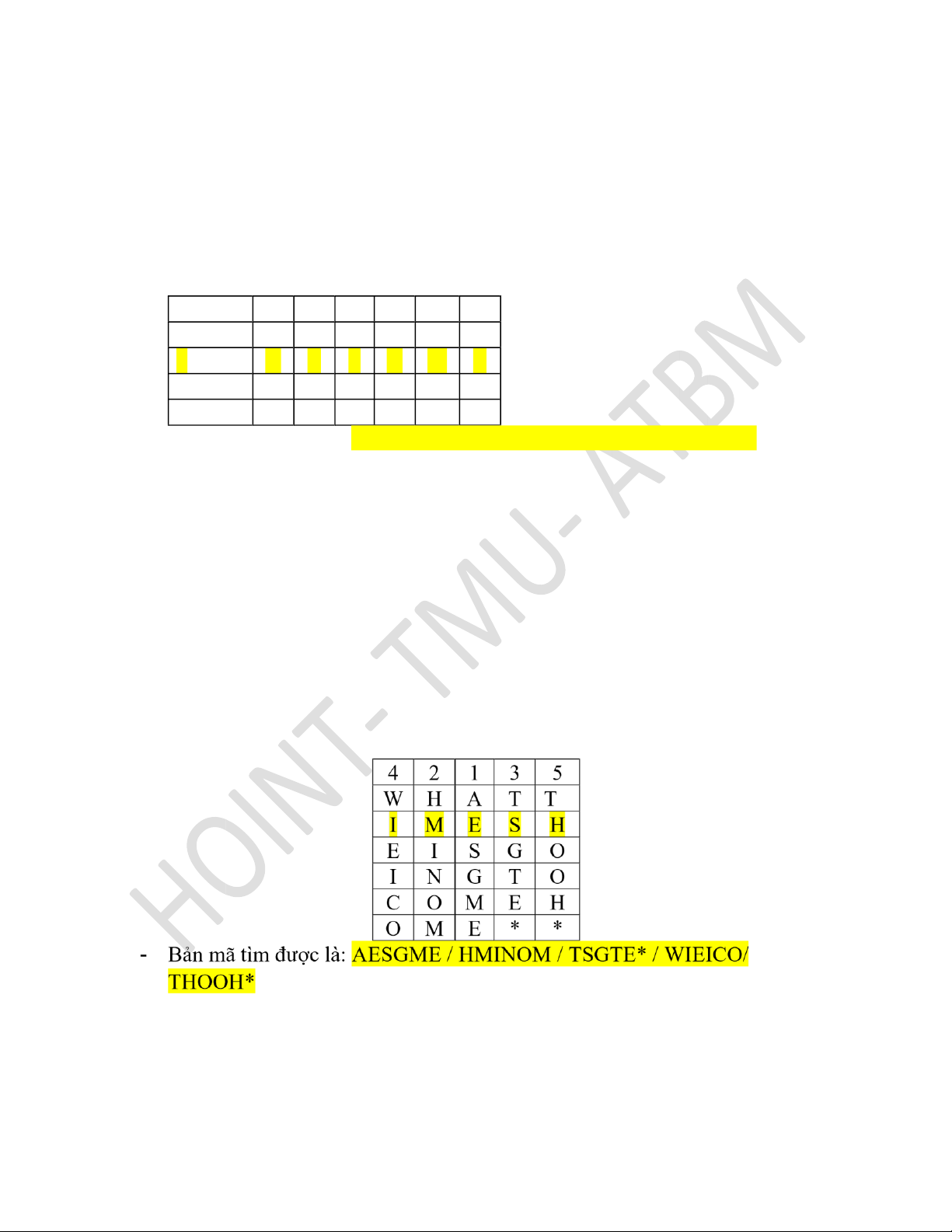 5. Cho bản mã “AESGMEHMINOMTSGTE*WIECOTHOOH*” được mã hóa