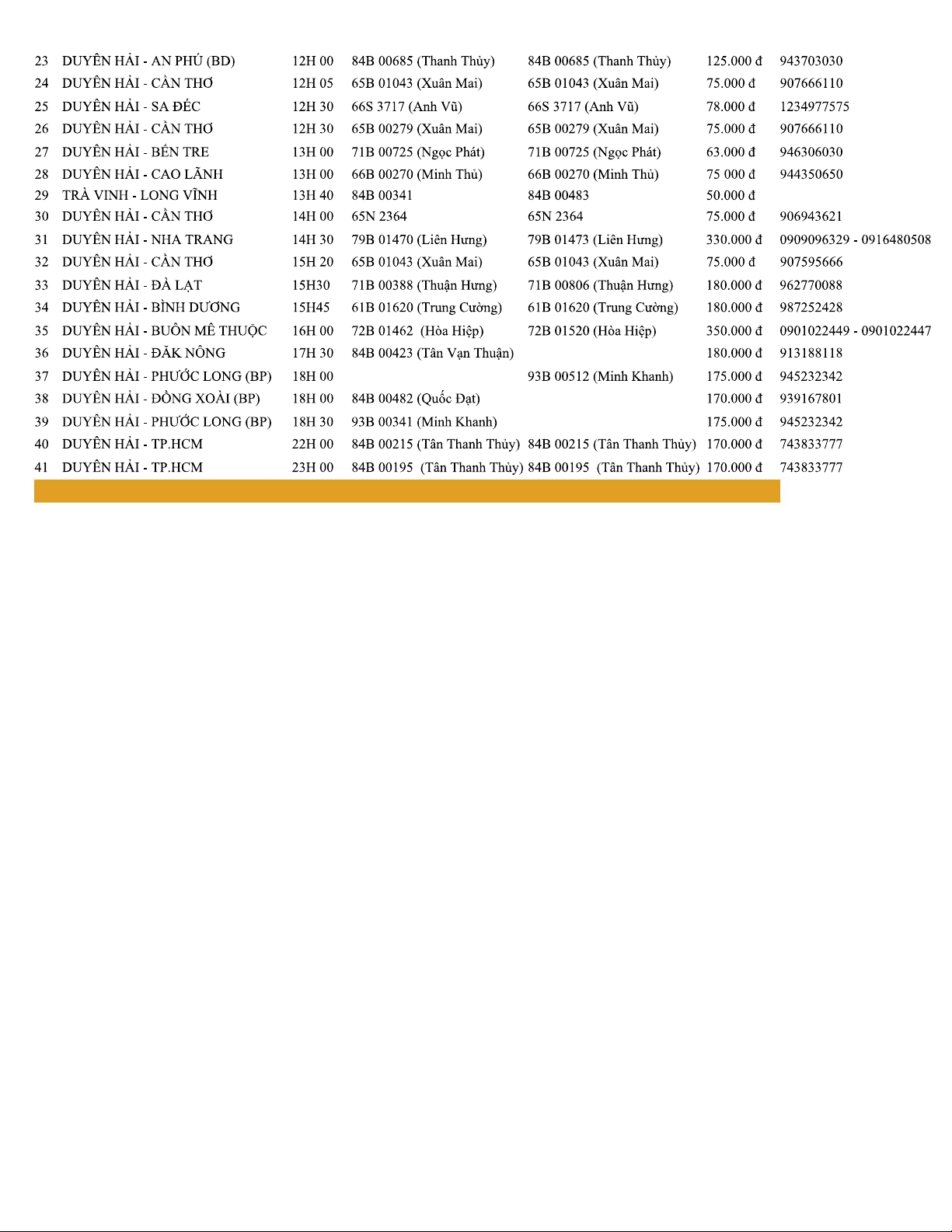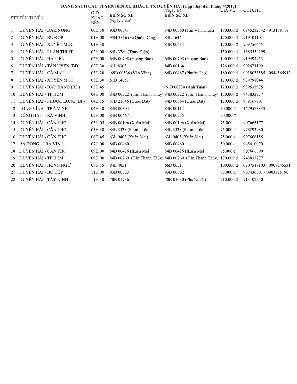 DANH SÁCH TUYẾN BẾN XE KHÁCH TX DUYÊN HẢI CẬP NHẬT 04/2017