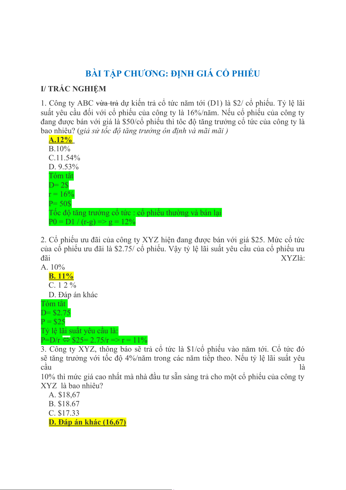 BÀI TẬP CHƯƠNG: ĐỊNH GIÁ CỔ PHIẾU I/ TRẮC NGHIỆM