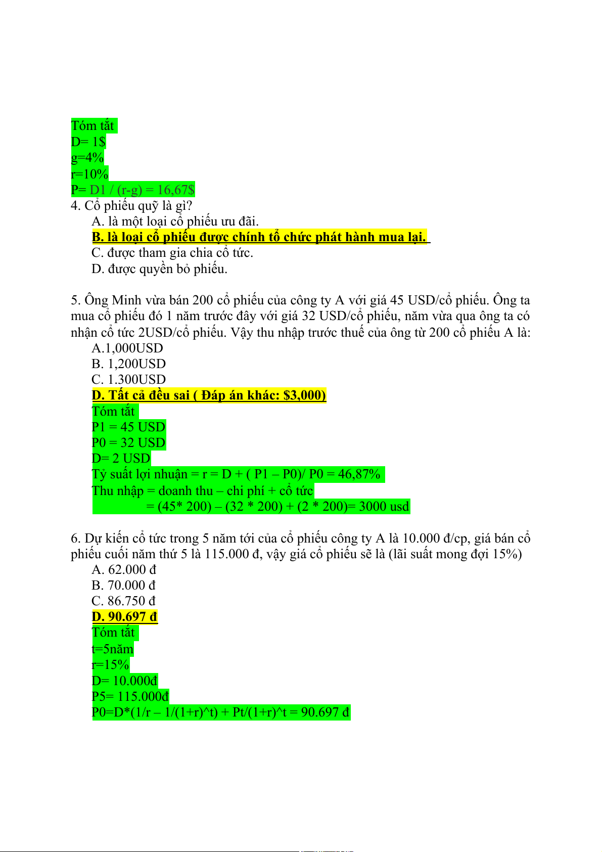 phiếu cuối năm thứ 5 là 115.000 đ, vậy giá cổ phiếu sẽ là (lãi suất mong đợi 15%) A. 62.000 đ B. 70.000 đ C. 86.750 đ D. 90.697 đ Tóm tắt t=5năm r=15% D= 10.000đ P5= 115.000đ