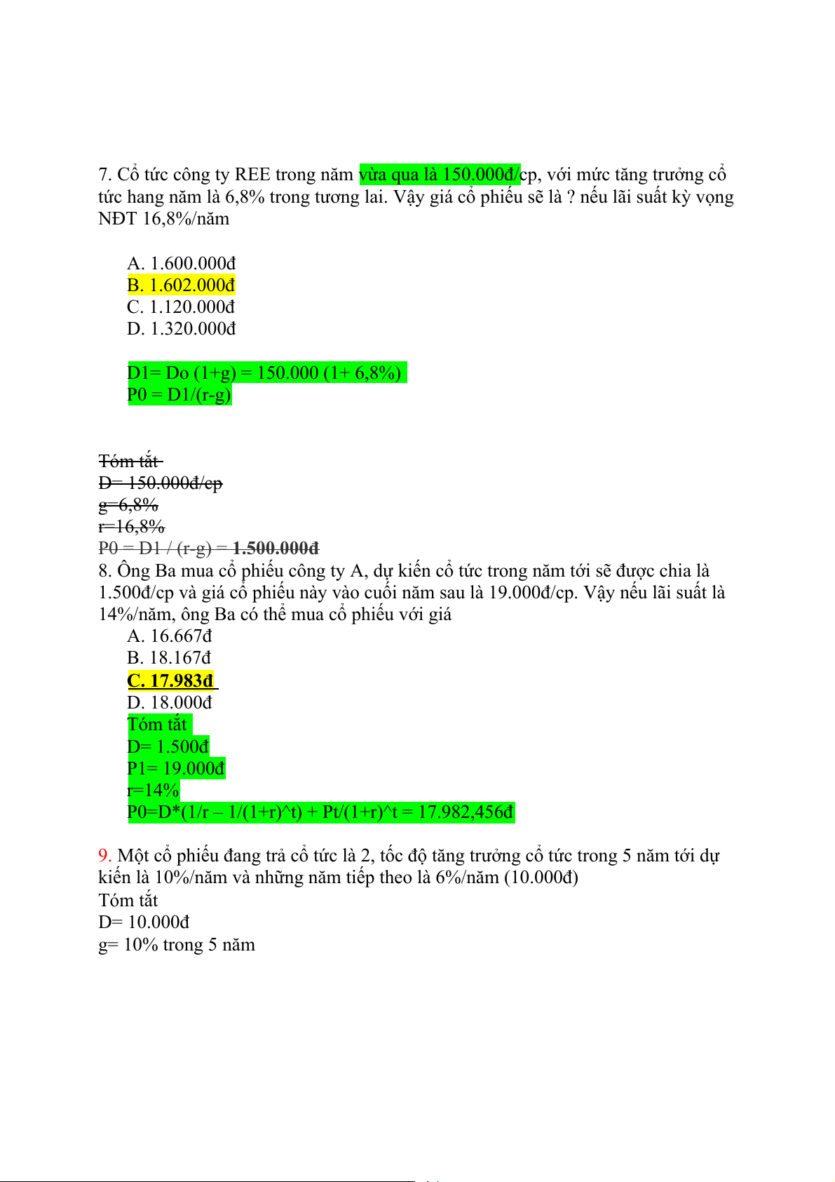 D1= Do (1+g) = 150.000 (1+ 6,8%) P0 = D1/(r-g) Tóm tắt D= 150.000đ/cp g=6,8% r=16,8%