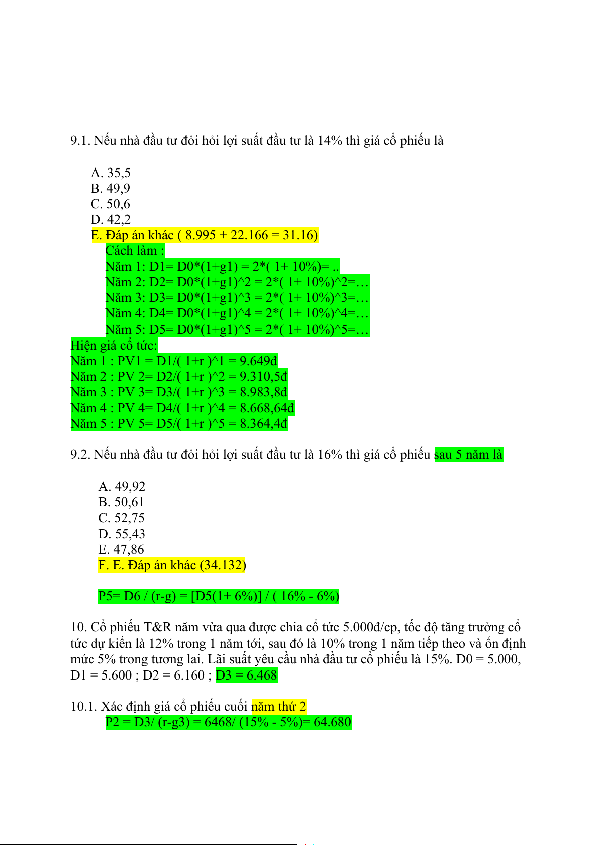 9.2. Nếu nhà đầu tư đỏi hỏi lợi suất đầu tư là 16% thì giá cổ phiếu sau 5 năm là A. 49,92 B. 50,61 C. 52,75 D. 55,43 E. 47,86 F. E. Đáp án khác (34.132)