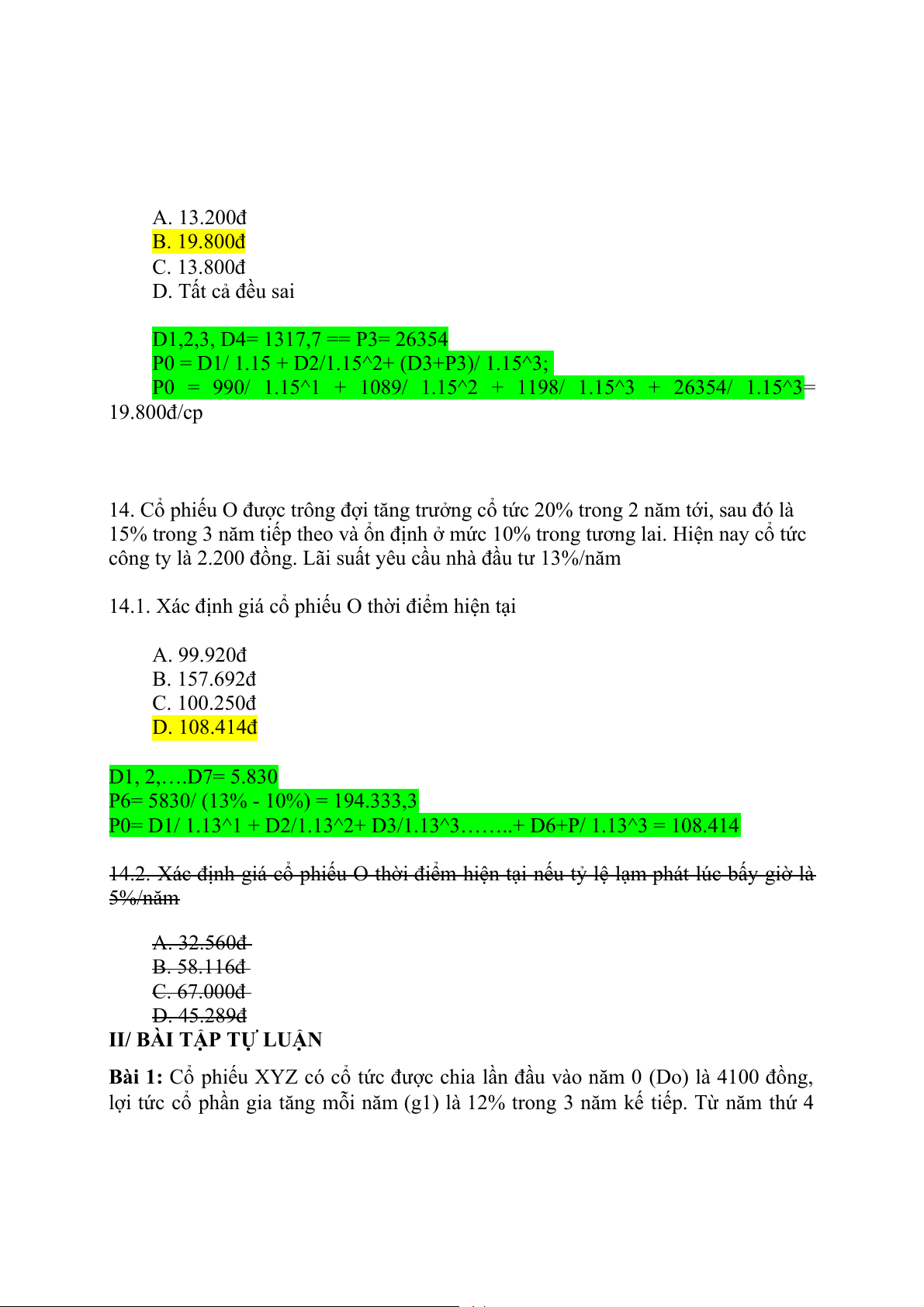 14.2. Xác định giá cổ phiếu O thời điểm hiện tại nếu tỷ lệ lạm phát lúc bấy giờ là 5%/năm A. 32.560đ B. 58.116đ C. 67.000đ D. 45.289đ