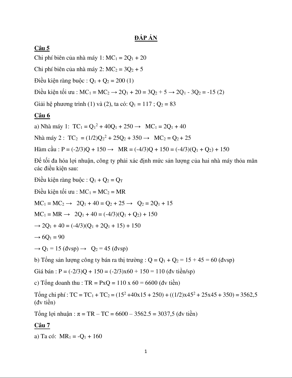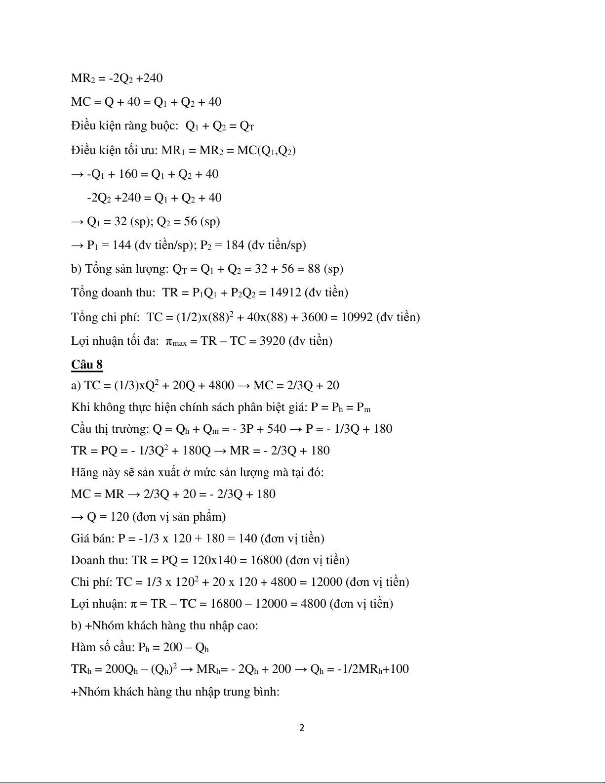 Tổng lợi nhuận : π = TR – TC = 6600 – 3562.5 = 3037,5 (đv tiền) Câu 7 a) Ta có: MR1 = -Q1 + 160 1 MR2 = -2Q2 +240 MC = Q + 40 = Q1 + Q2 + 40