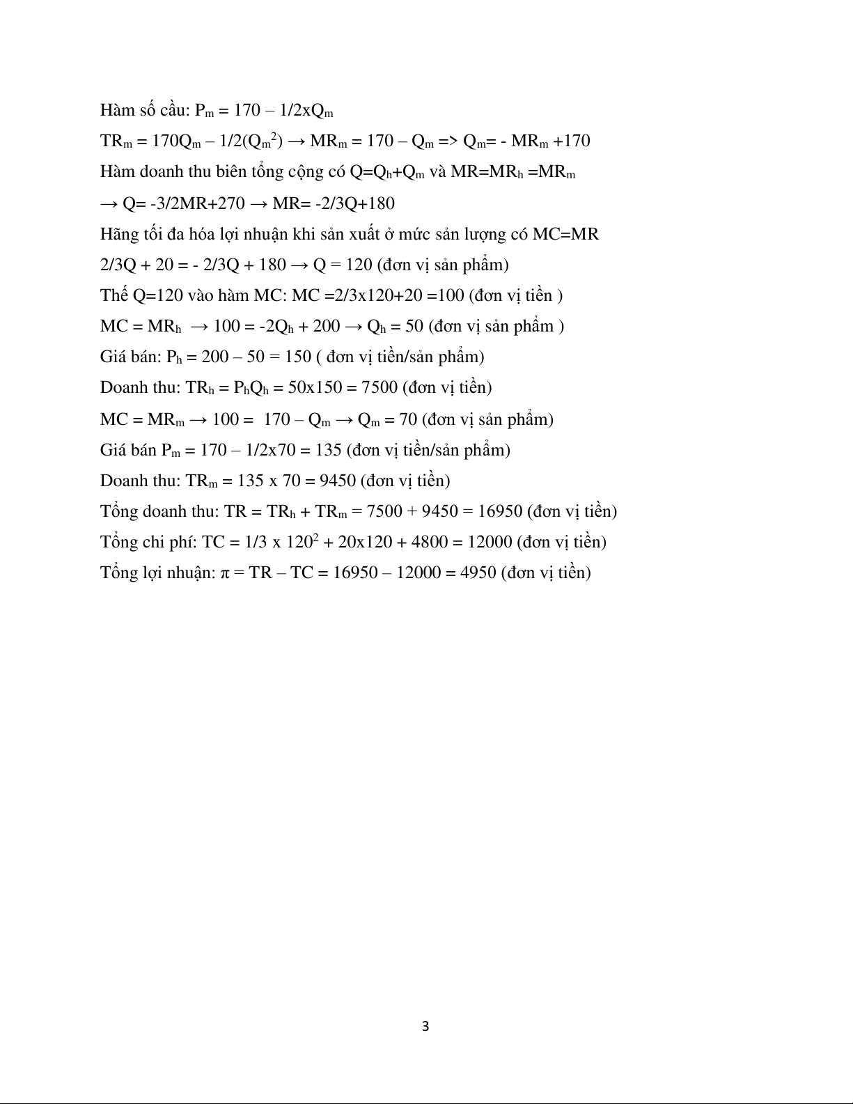 Tổng lợi nhuận: π = TR – TC = 16950 – 12000 = 4950 (đơn vị tiền) 3