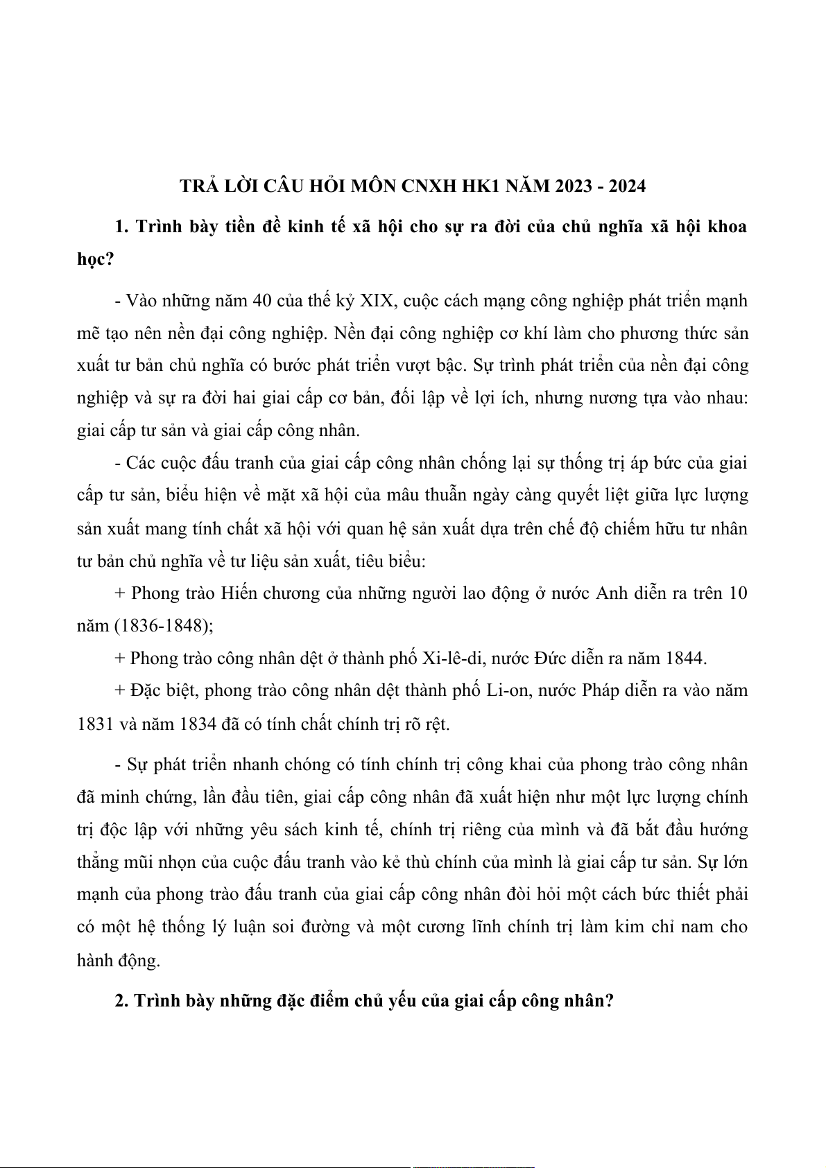 TRẢ LỜI CÂU HỎI MÔN CNXH HK1 NĂM 2023 - 2024