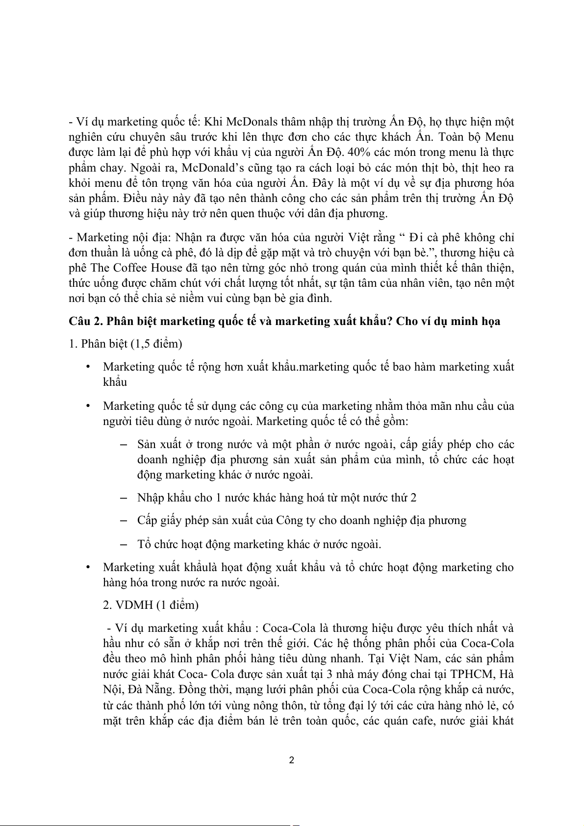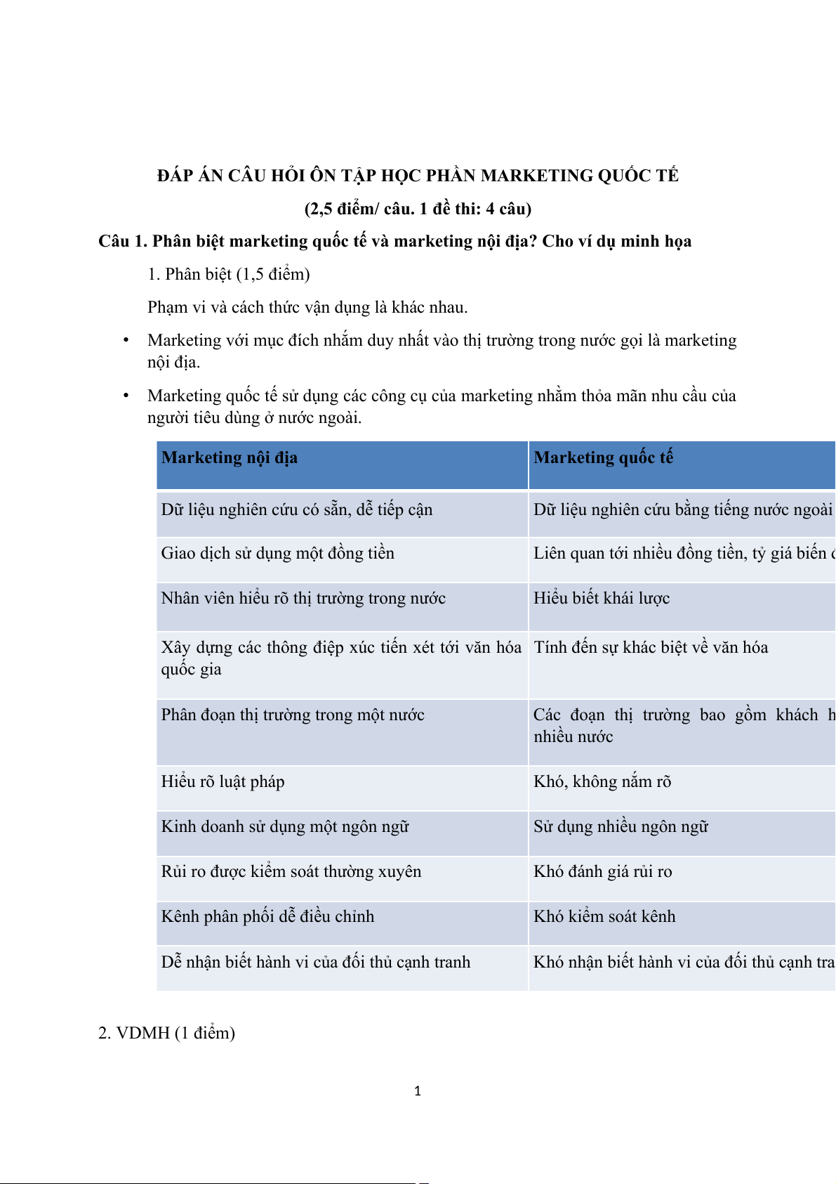 Câu 1. Phân biệt marketing quốc tế và marketing nội địa? Cho ví dụ minh họa 1. Phân biệt (1,5 điểm)