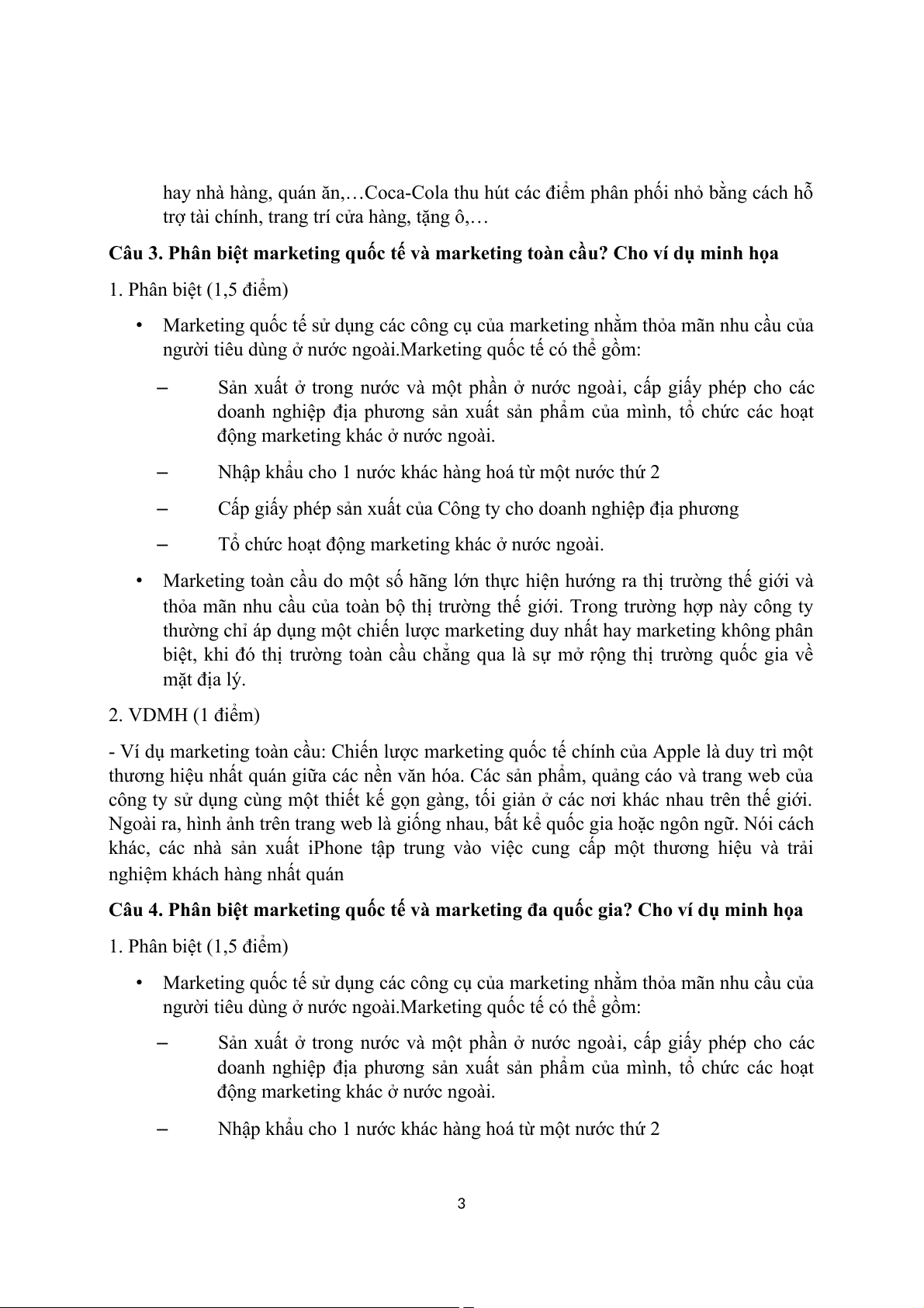 Câu 3. Phân biệt marketing quốc tế và marketing toàn cầu? Cho ví dụ minh họa 1. Phân biệt (1,5 điểm) •