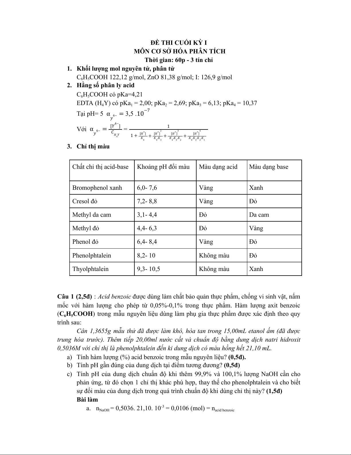 sự đổi màu của dung dịch trong quá trình chuẩn độ khi dùng chỉ thị này? (1,5đ) Bài làm a. n -3 NaOH = 0,5036. 21,10. 10 = 0,0106 (mol) = nacid benzoic